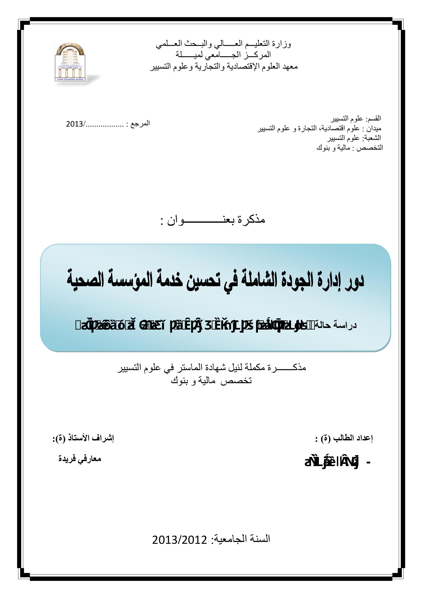 عاشوري نسيمة & معارفي فريدة(مشرفا) (2013). دور إدارة الجودة الشاملة في تحسين خدمة المؤسسات الصحية.