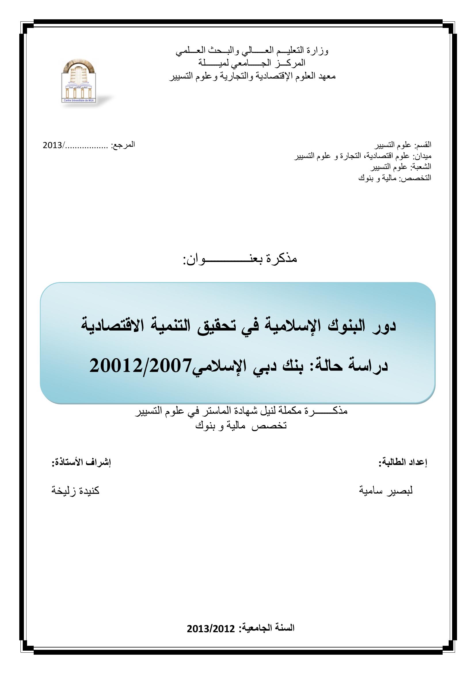 دور البنوك الإسلامية في تحقيق التنمية الإقتصادية دراسة حالة بنك دبي الإسلامي 2007-2012