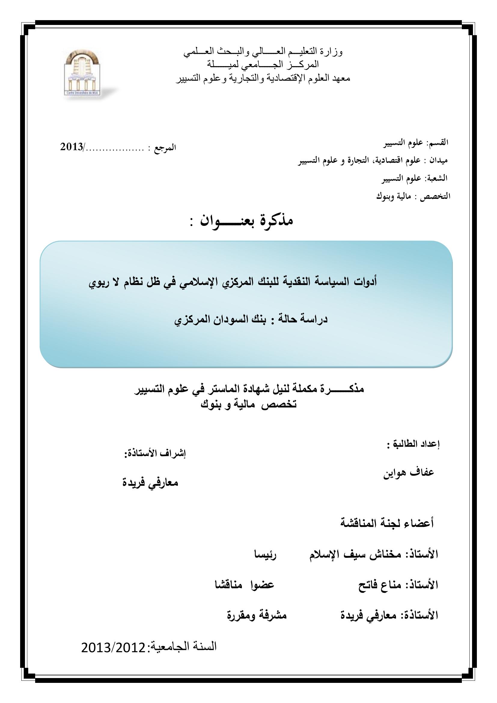 هواين عفاف & , م. (2013). أدوات السياسة النقدية للبنك المركزي الإسلامي في ظل نظام لا ربوي دراسة حالة : بنك السودان المركزي.