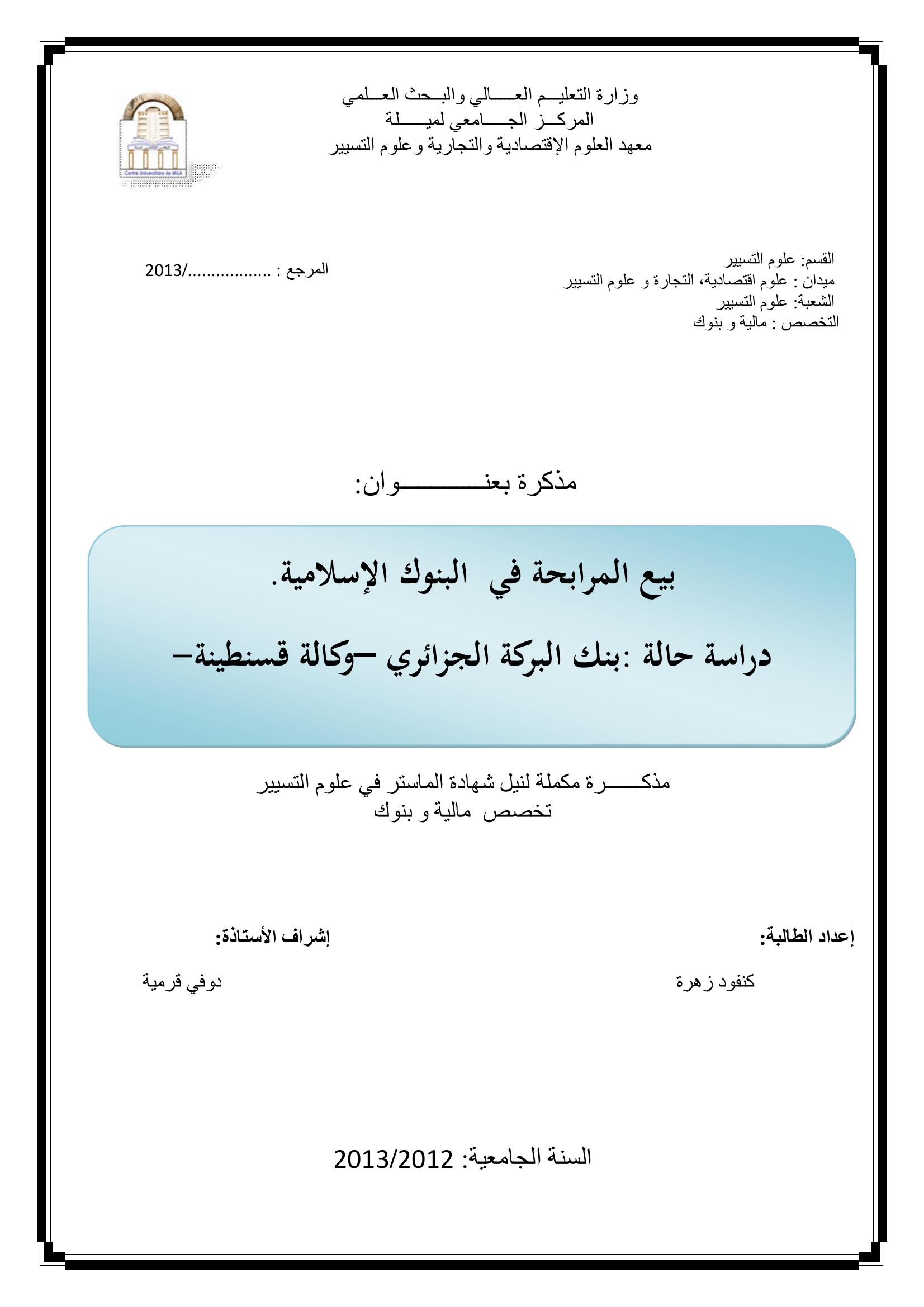 كنفود زهرة & دوفي قرمية(مشرفا) (2013). بيع المرابحة في البنوك الإسلامية دراسة حالة بنك البركة الجزائري -وكالة قسنطينة -.