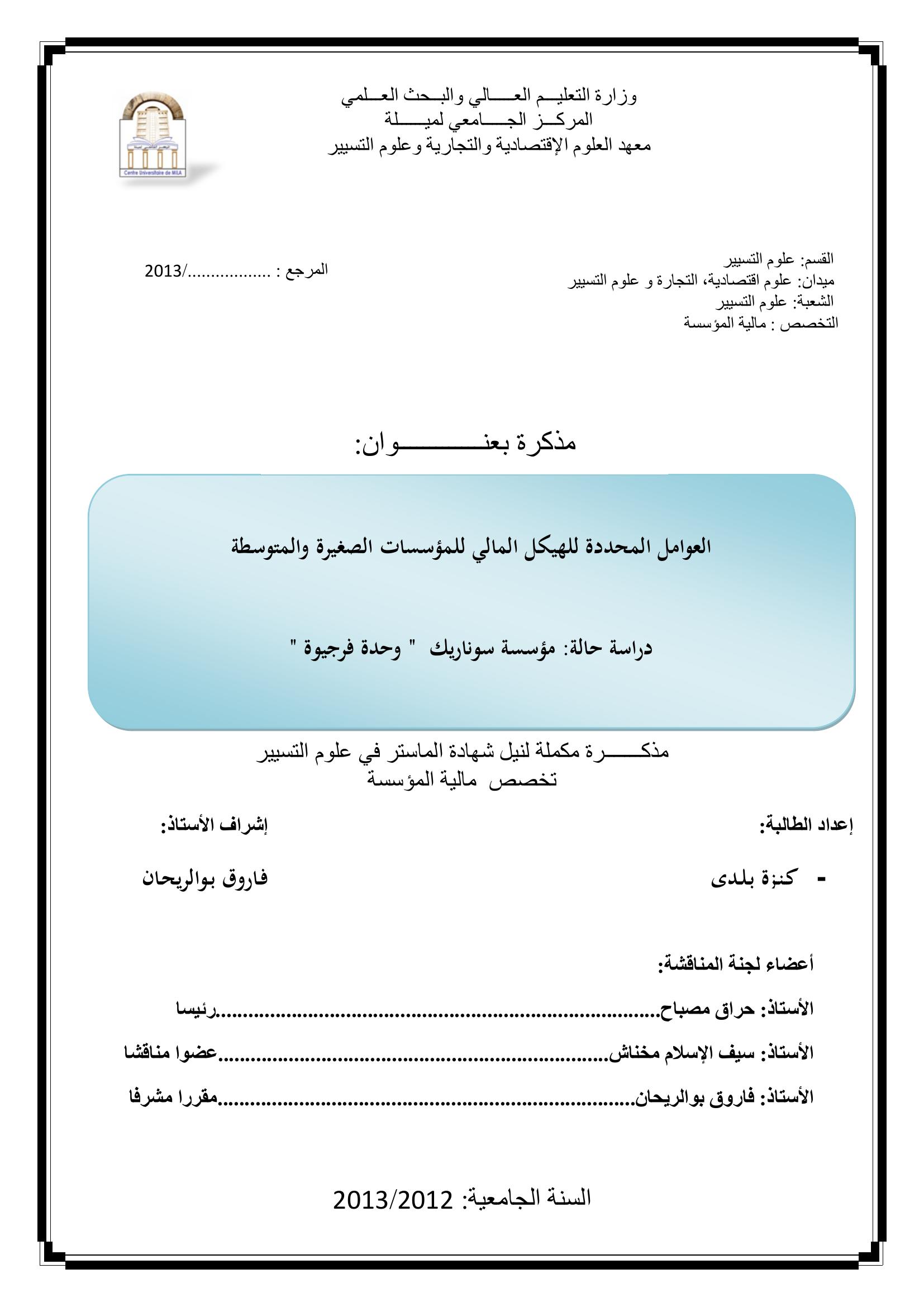 بلدي كنزة & حراق مصباح(رئيسا), م. (2013). العوامل المحددة للهيكل المالي للمؤسسات الصغيرة والمتوسطة دراسة حالة : مؤسسة سوناريك "وحدة فرجيوة''.