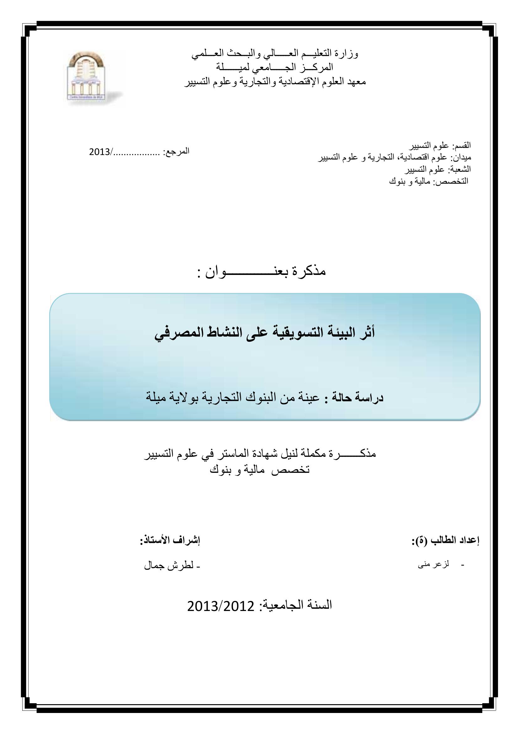 لزعر منى & لطرش جمال(مشرفا) (2013). أثر البيئة التسويقية على النشاط المصرفي دراسة حالة عينة من البنوك التجارية لولاية ميلة.