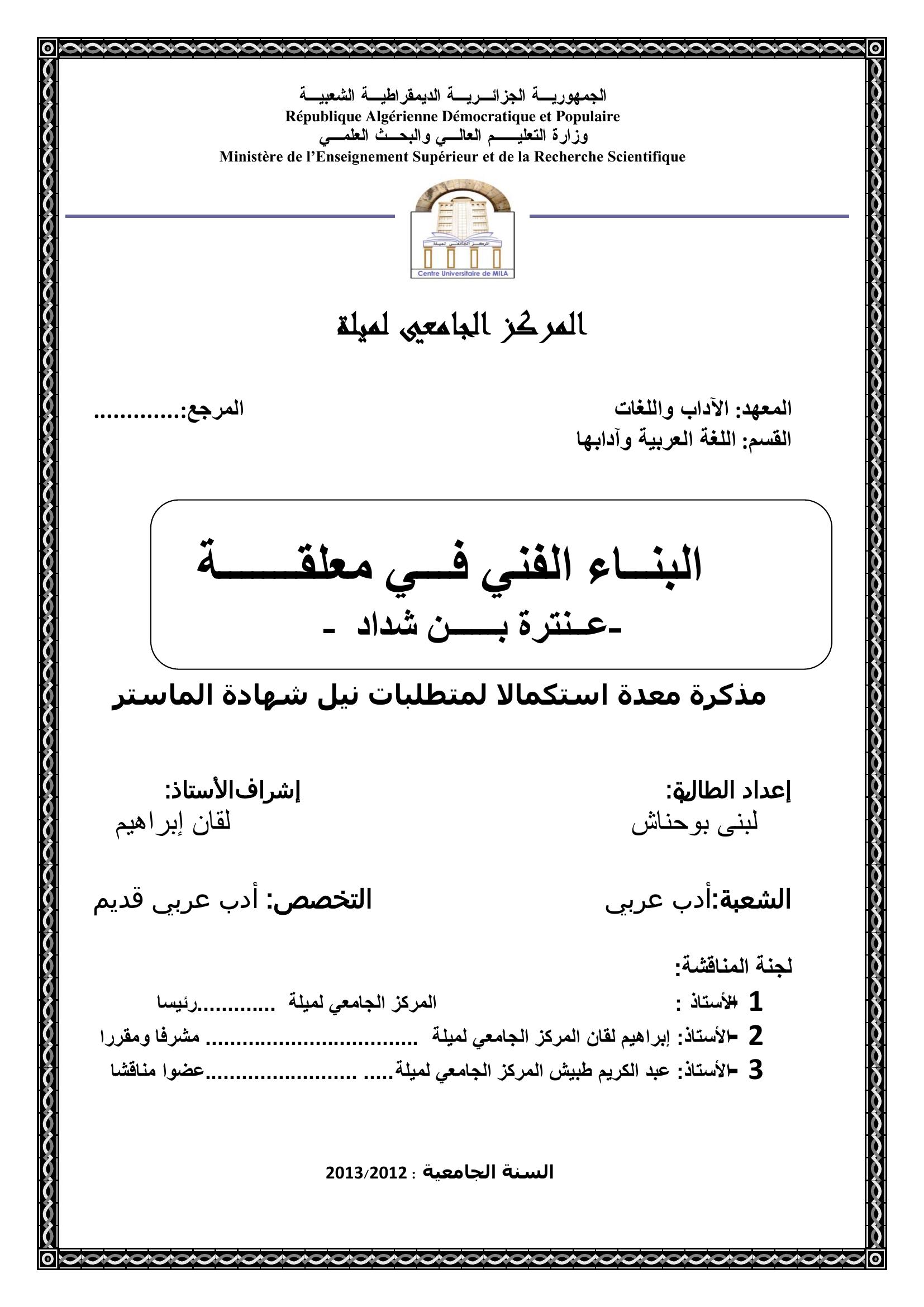بوحناش لبنى & لقان ابراهيم (مشرفا) (2013). البناء الفني في معلقة -عنترة بن شداد-.