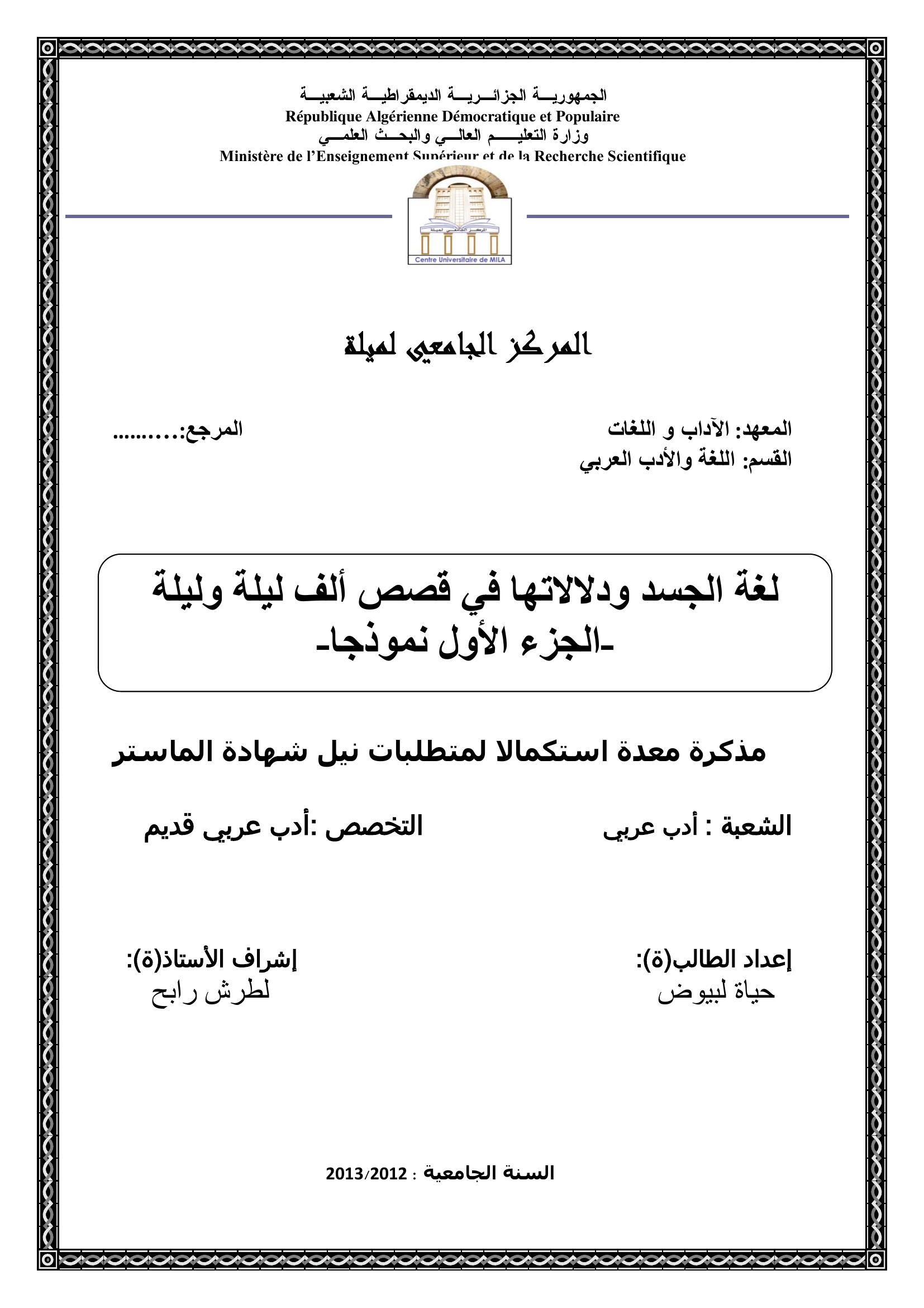 بيوض حياة & الأطرش رابح( مشرفا) (2013). لغة الجسد ودلالاتها في قصص ألف ليلة وليلة - الجزء الأول نموذجا -.