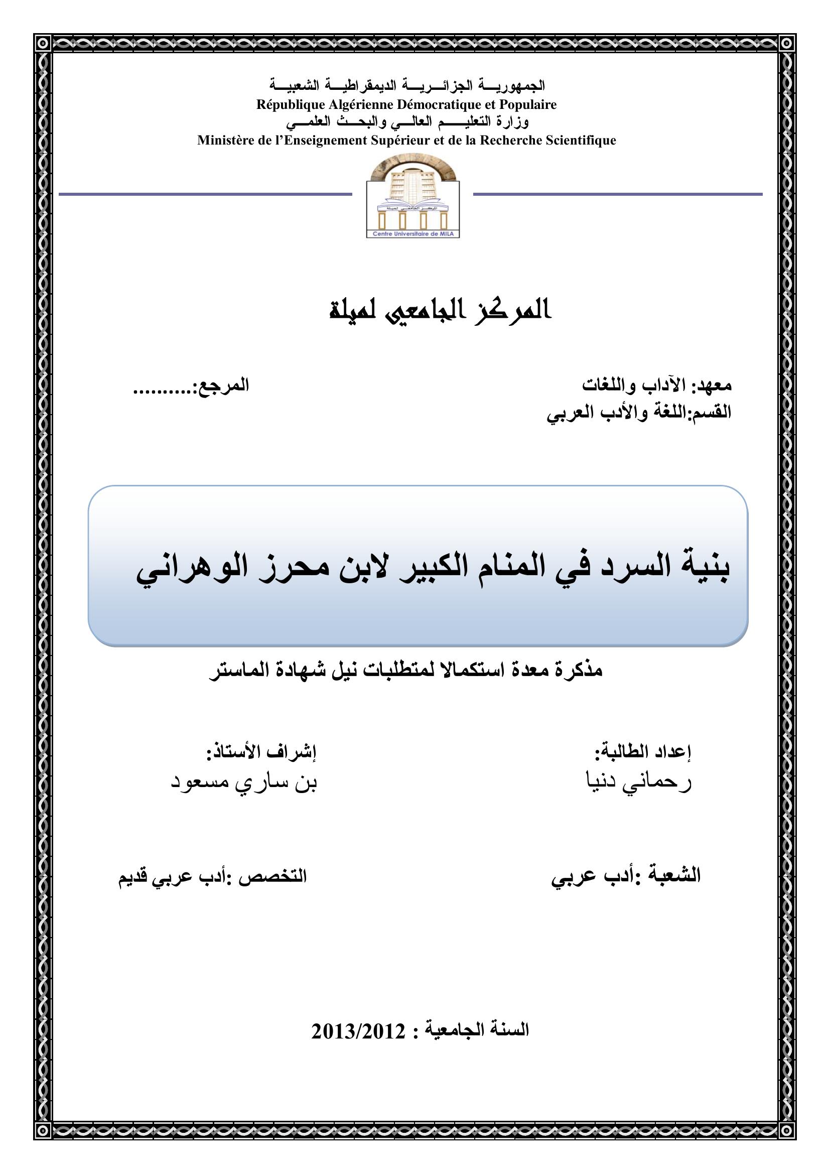 رحماني دنيا & بن ساري مسعود(مشرفا) (2013). بنية السرد في المنام الكبير لابن محرز الوهراني.
