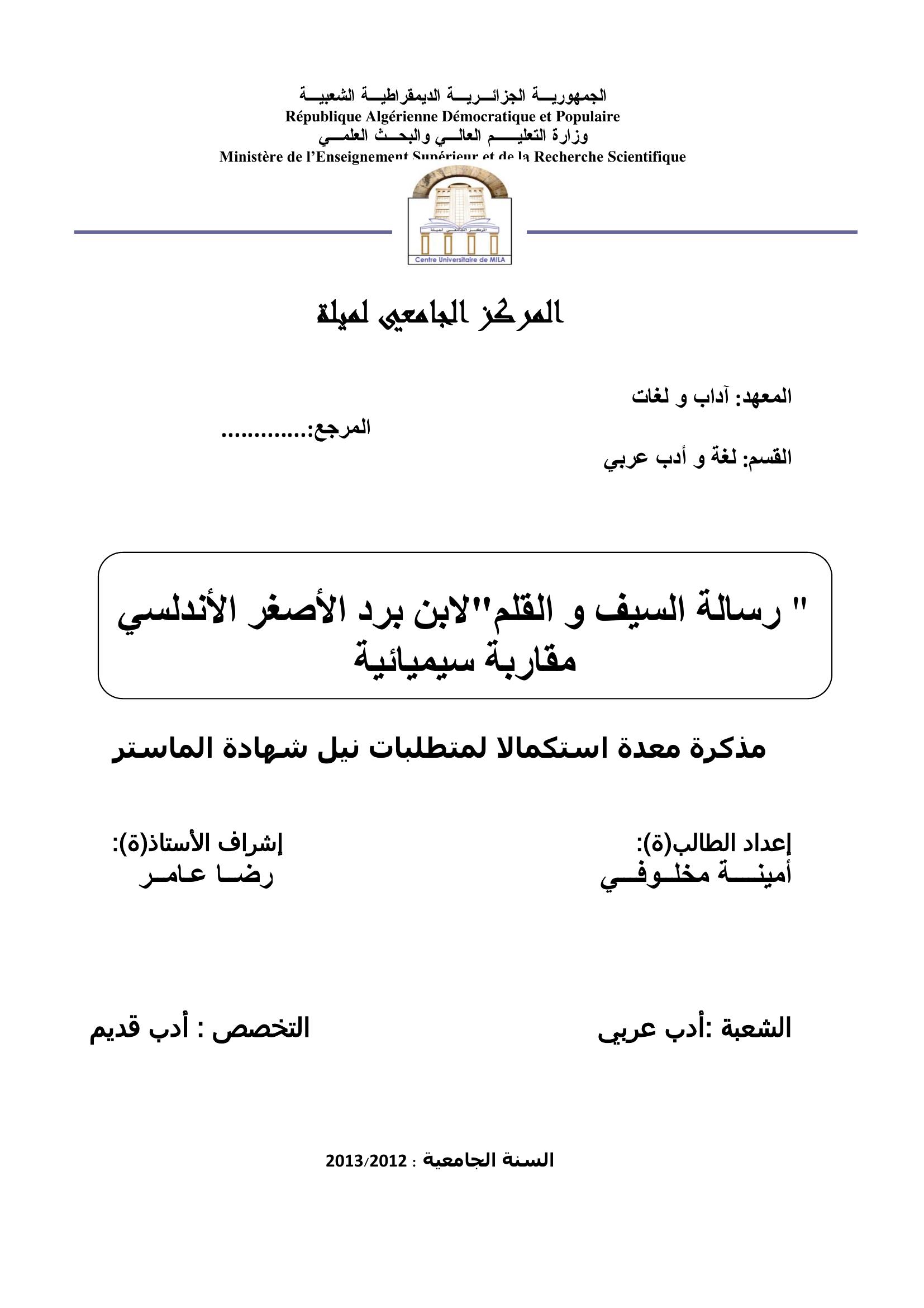 مخلوفي أمينة & عامر رضا (مشرفا) (2013). رسالة السيف والقلم لابن برد الأصغر الأندلسي مقاربة سيميائية.