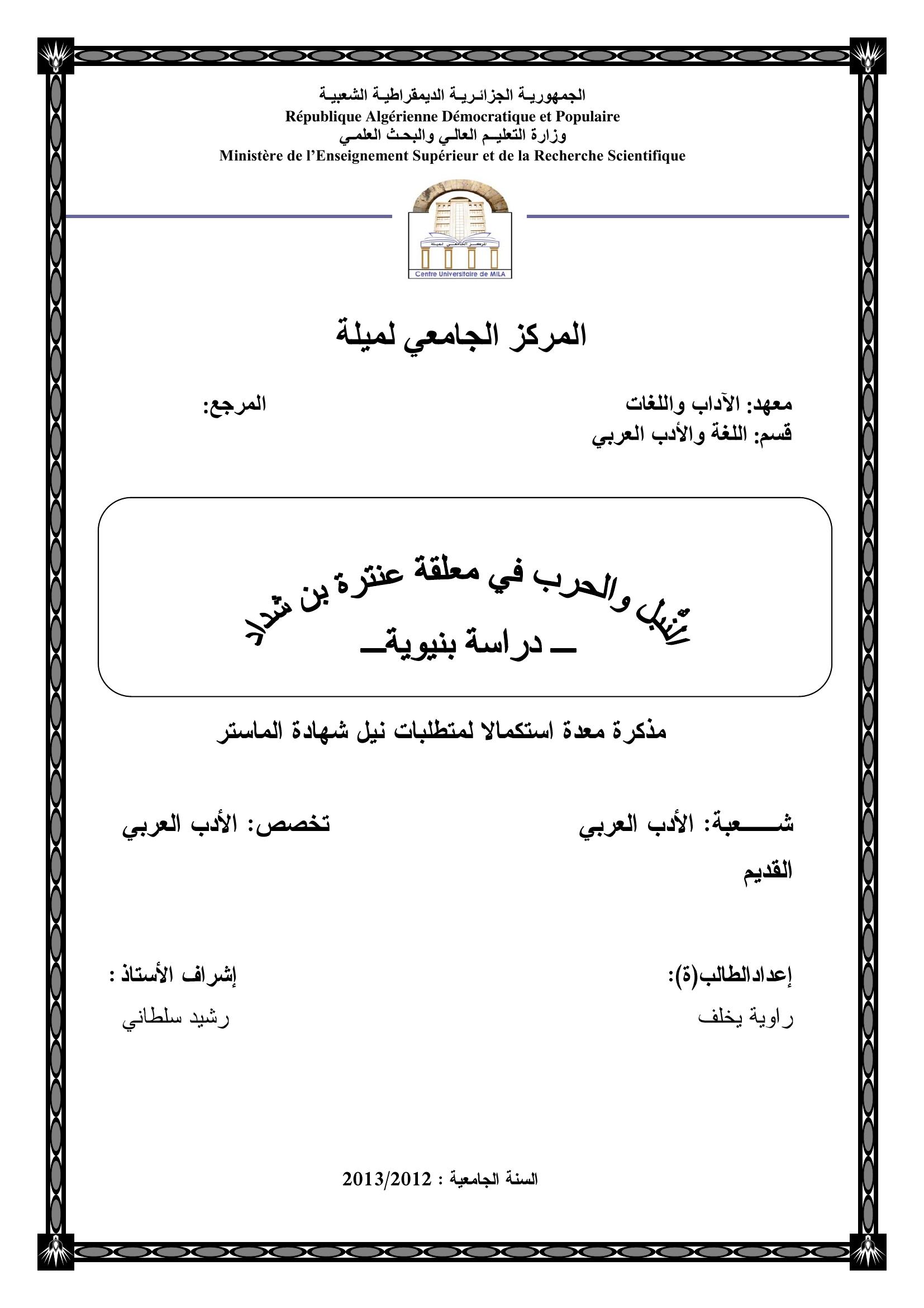 راوية يخلف & سلطاني رشيد(مشرفا) (2013). النّبل والحرب في معلقة عنترة بن شداد: ــ دراسة بنيوية ـ.