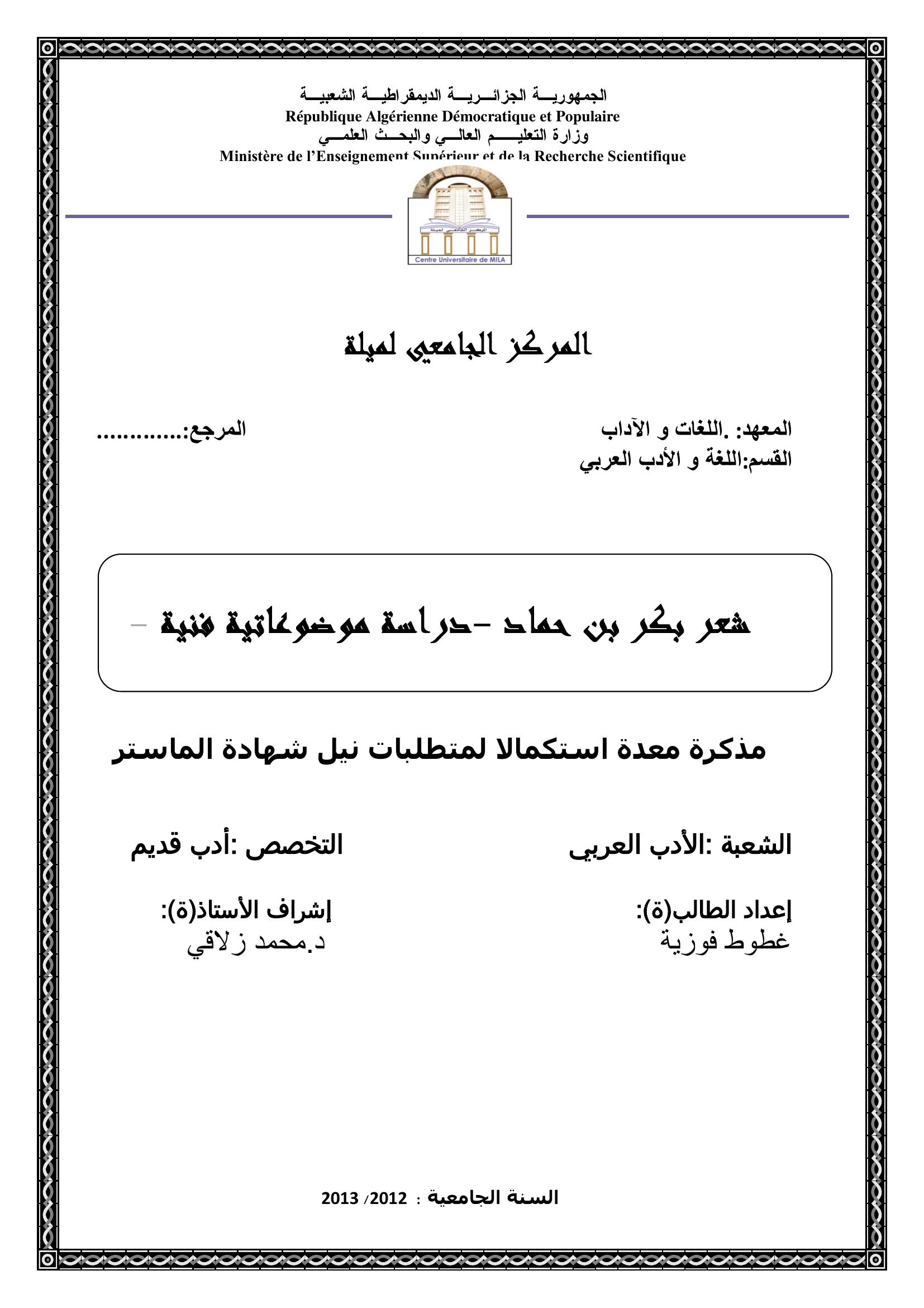 غطوط فوزية & زلاقي محمد( مشرفا) (2013). شعر بكر بن حماد -دراسة موضوعاتية فنية-.