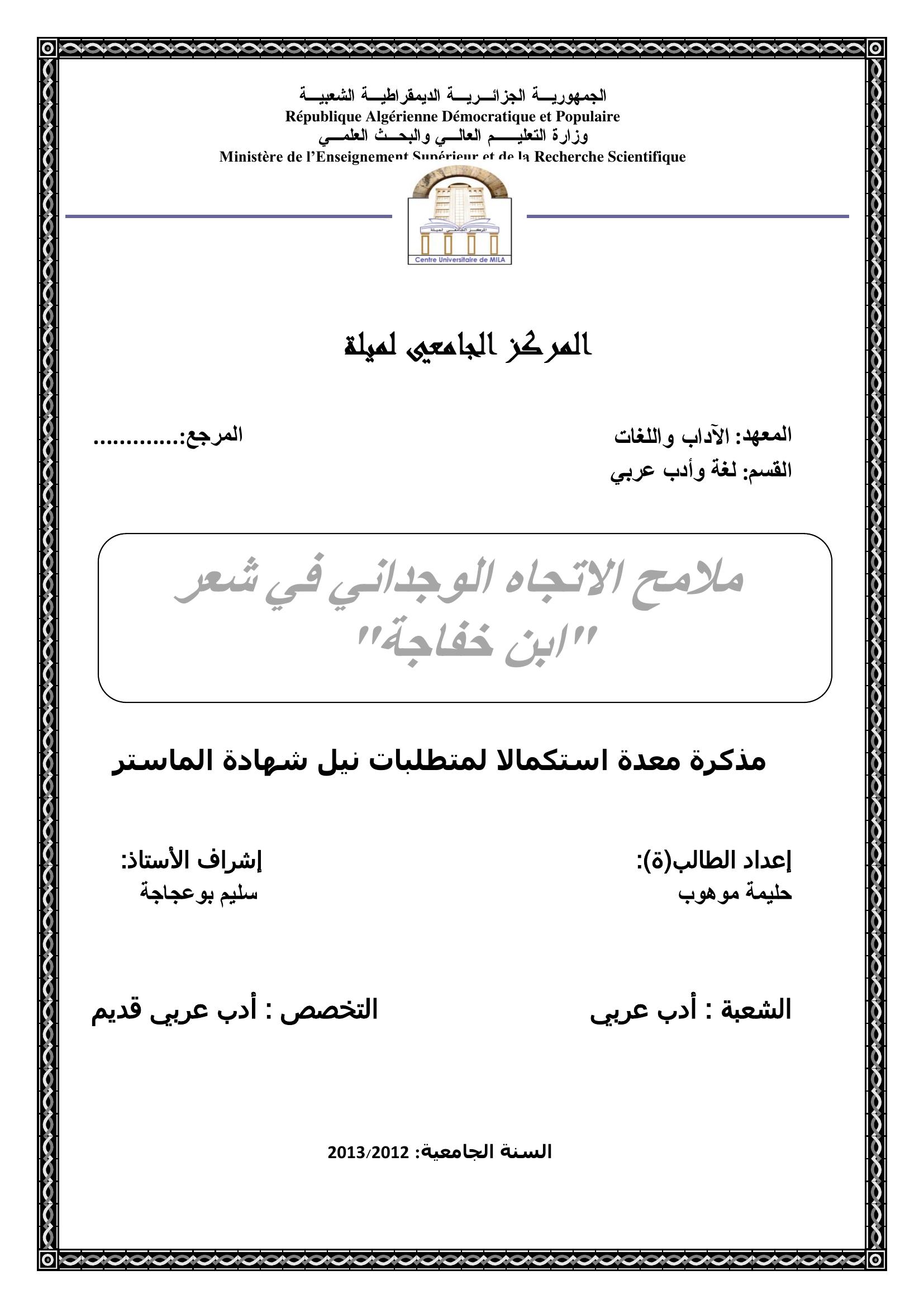 حليمة موهوب & بوعجاجة سليم (مشرفا) (2013). ملامح الاتجاه الوجداني في شعر ''ابن خفاجة''.
