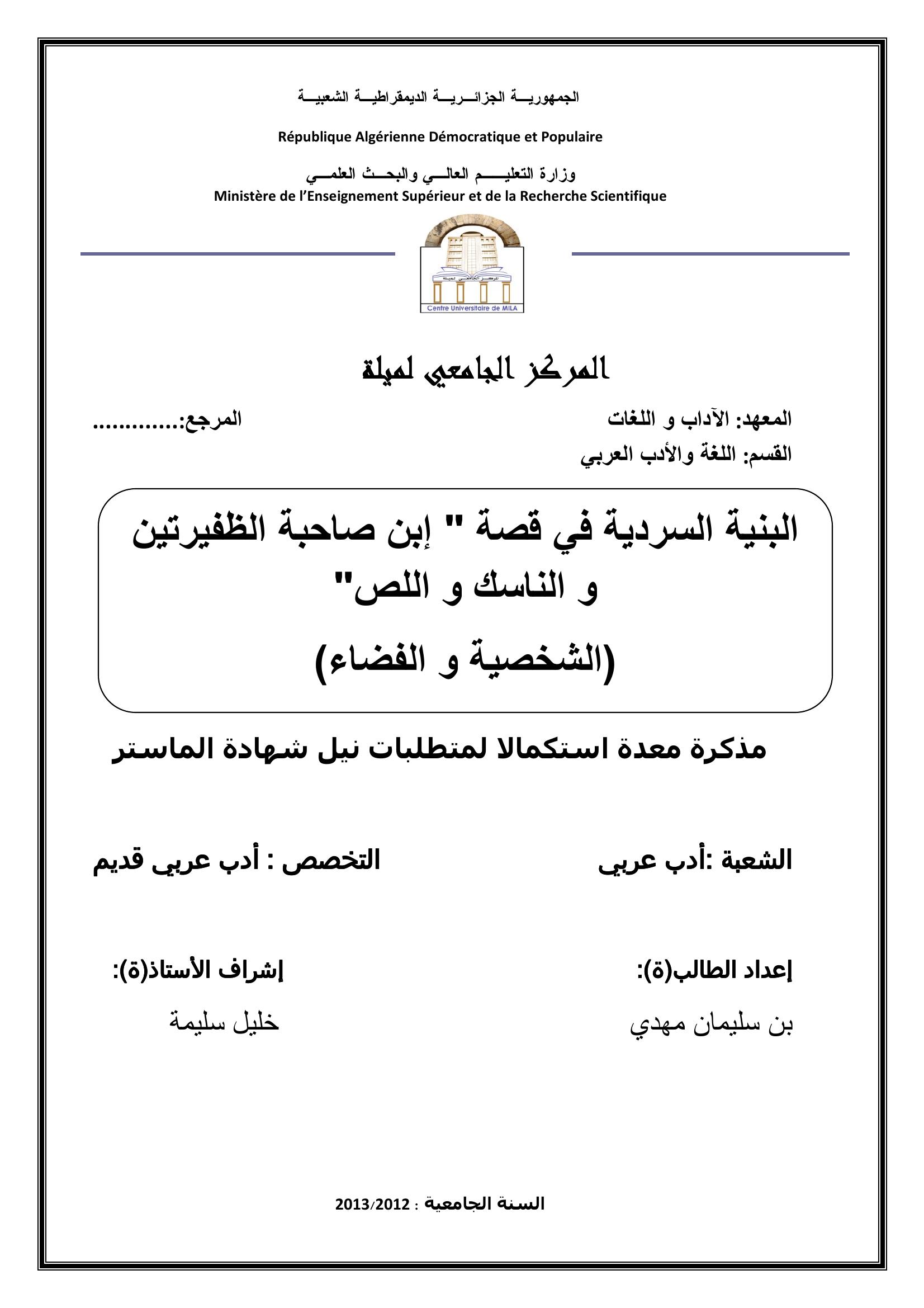 بن سليمان مهدي & خليل سليمة (مشرفا) (2013). البنية السردية في قصة '' إبن صاحبة الظفيرتين والناسك واللص'' ( الشخصية والفضاء).