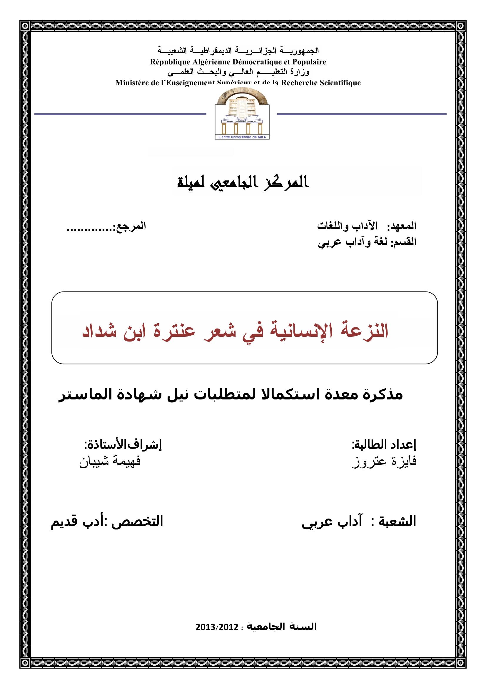 عتروزفيروز & زيادي شيبان فهيمة( مشرفا) (2013). النزعة الإنسانية في شعر عنترة بن شداد.