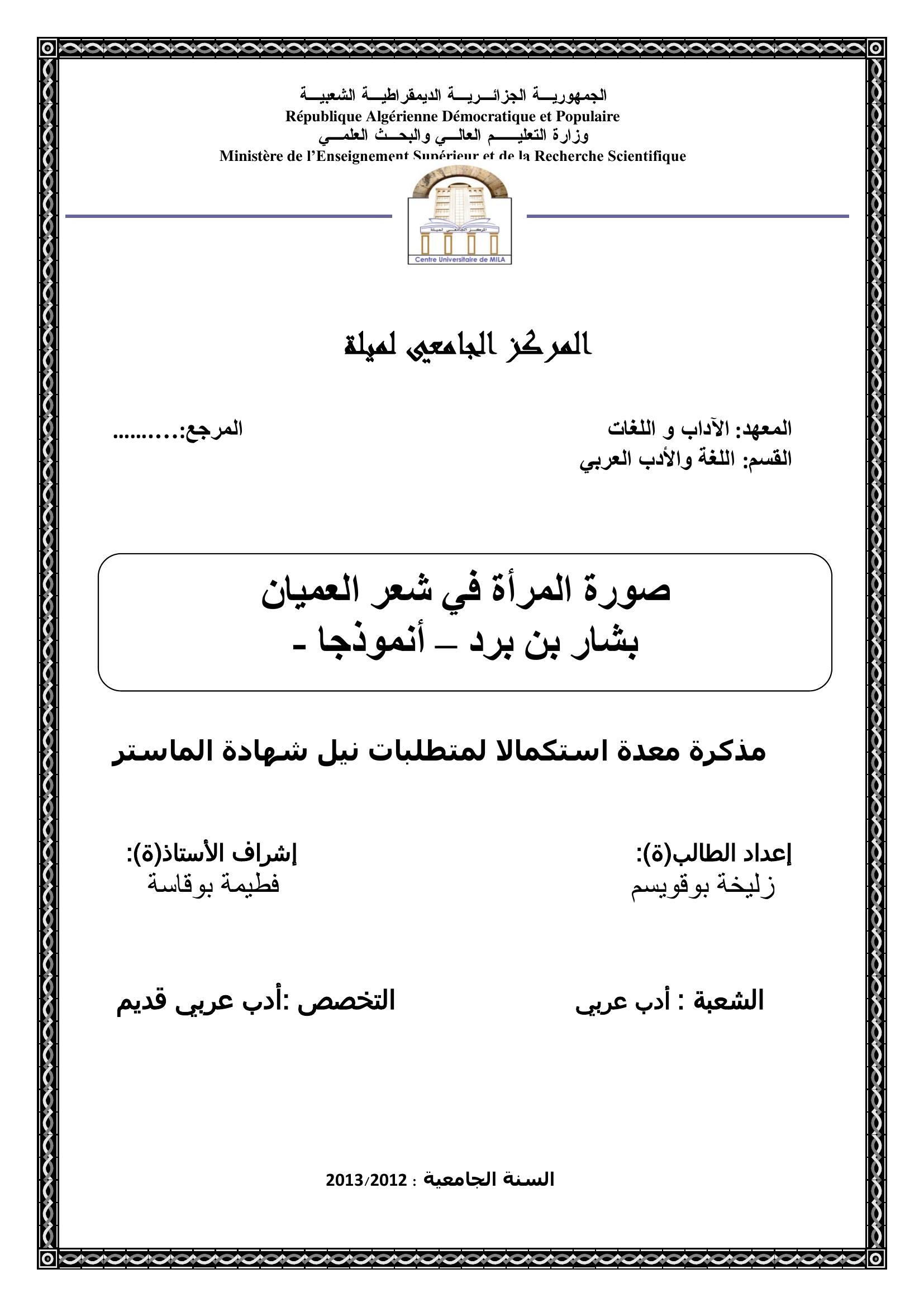 زليخة بوقويسم & بوقاسة فطيمة ( مشرفا) (2013). صورة المرأة في شعر العميان بشار بن برد - أ نمودجا -.