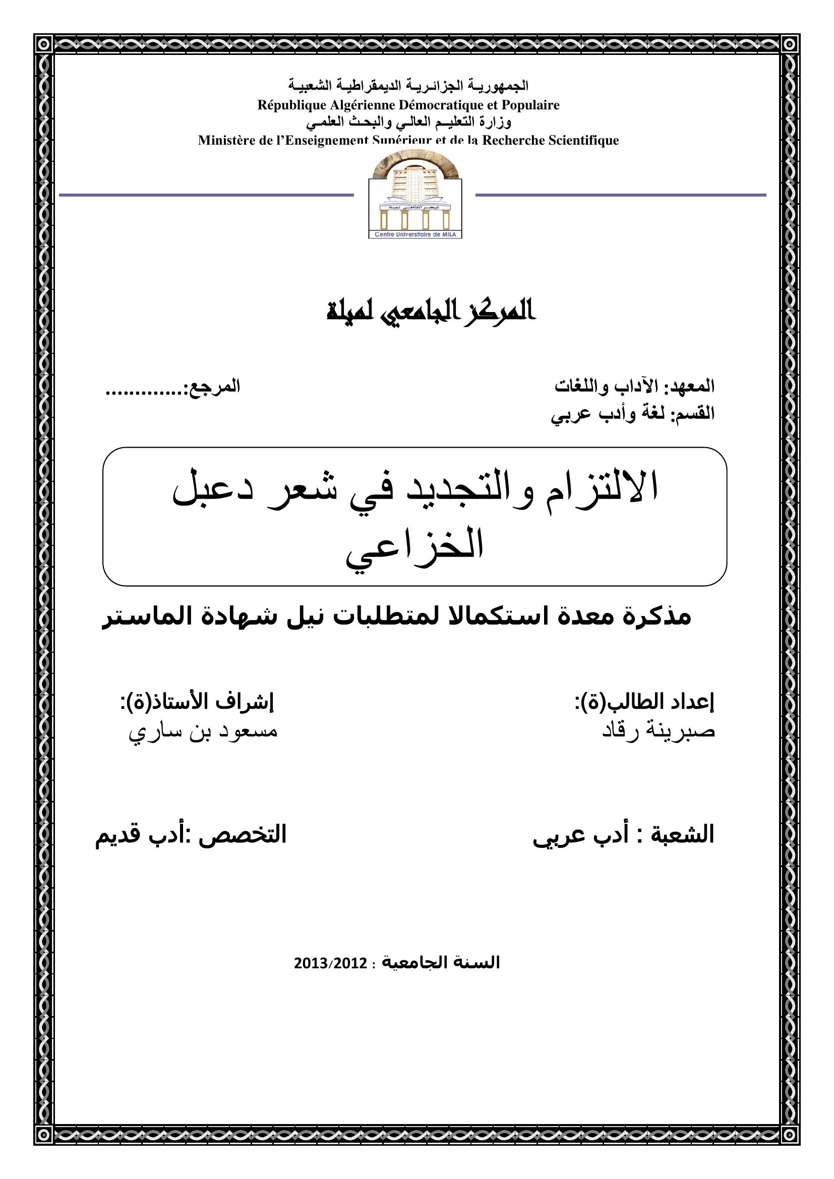 صبرينة رقاد & بن ساري مسعود(مشرفا) (2013). الالتزام والتجديد في شعر دعبل الخزاعي.