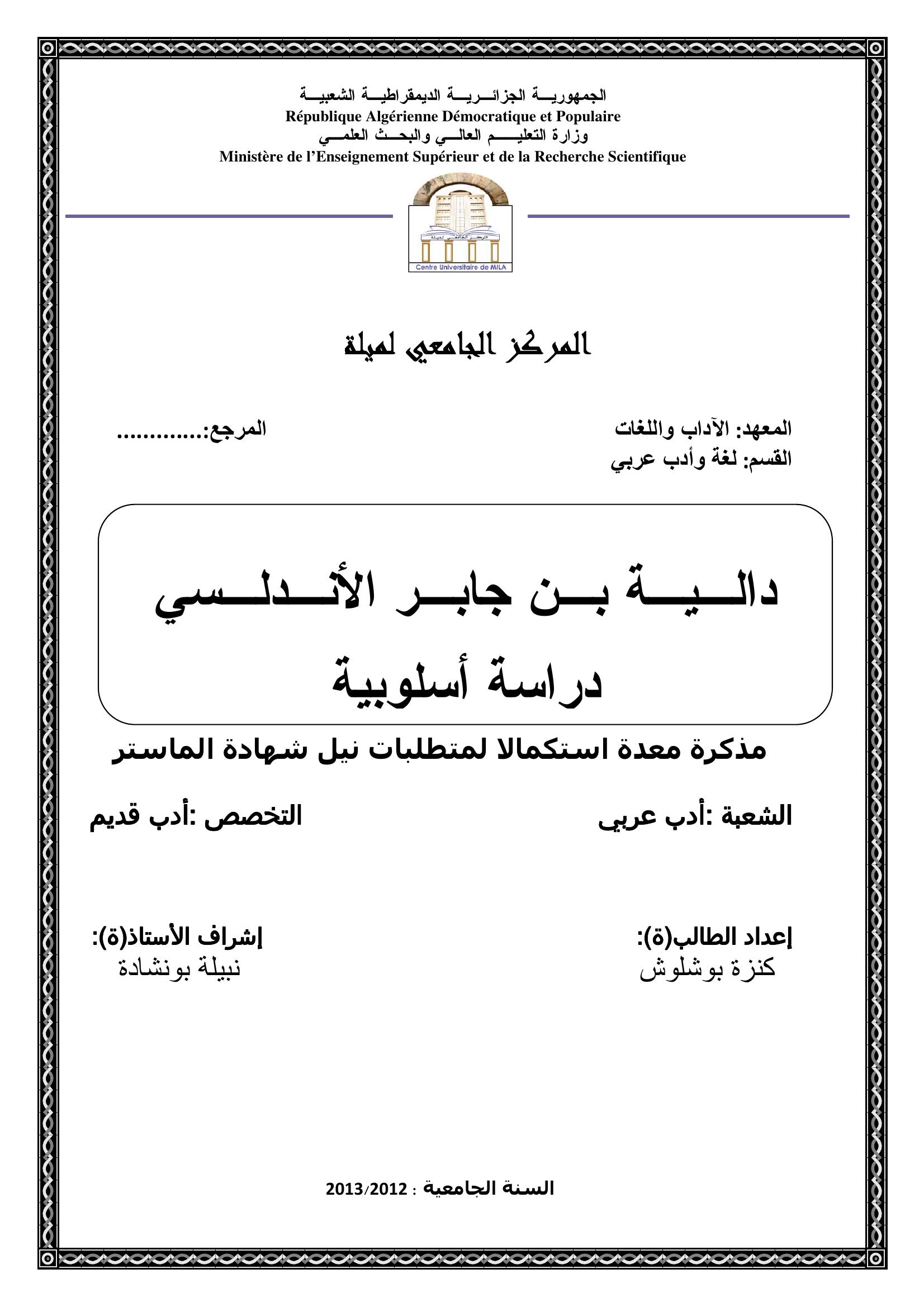 كنزة بوشلوش & بونشادة نبيلة (مشرفا) (2013). دالية بن جابر الأندلسي : دراسة أسلوبية.