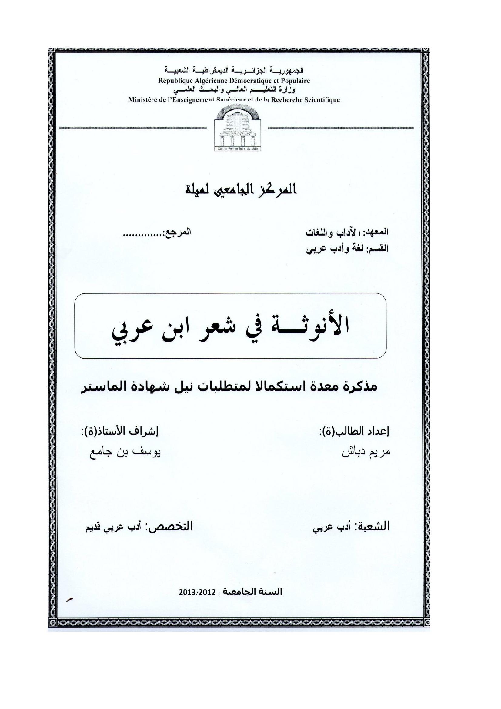 دباش مريم & بن جامع يوسف (مشرفا) (2013). الأنوثة في شعر ابن عربي.