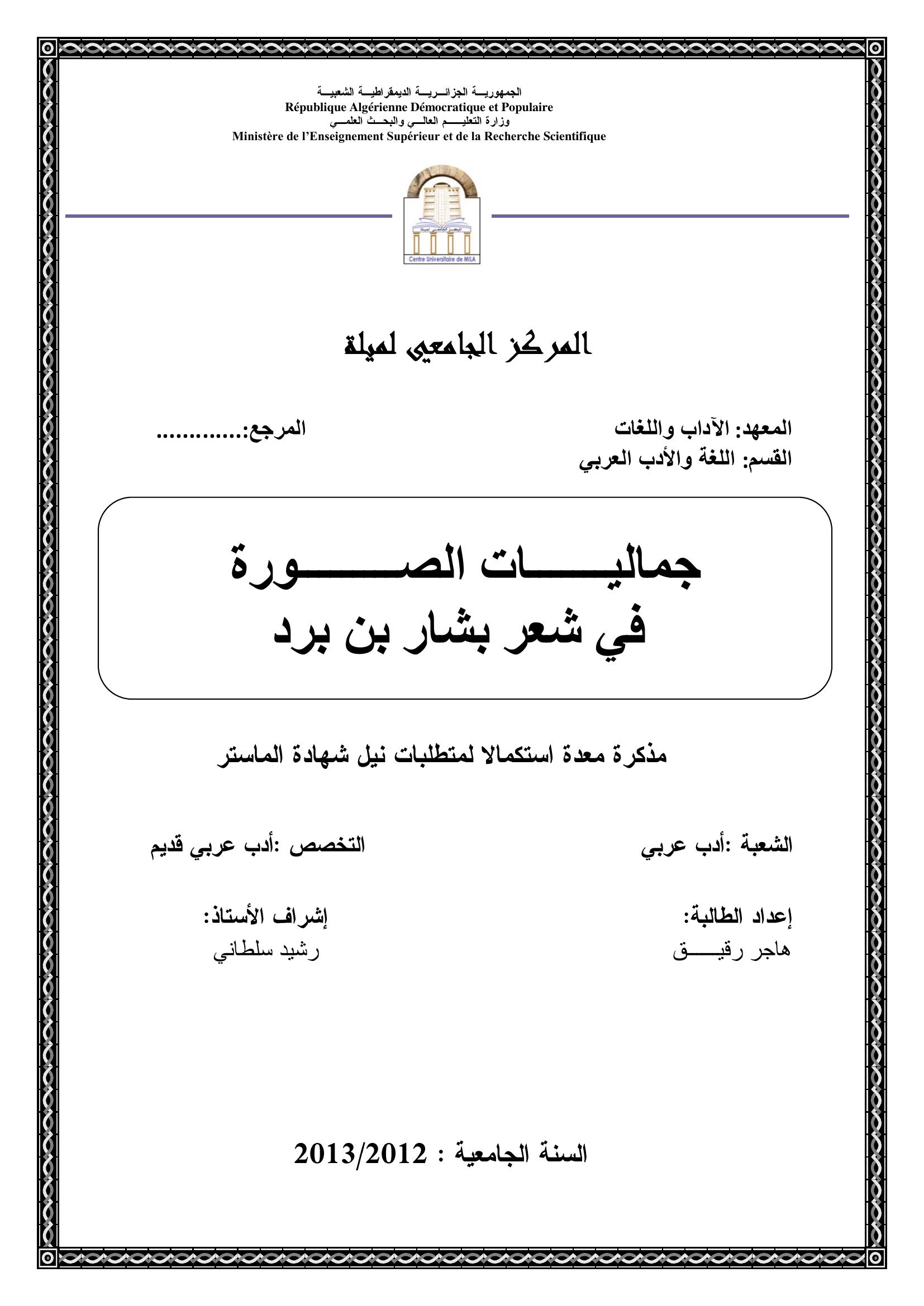 هاجر رقيق & سلطاني رشيد(مشرفا) (2013). جماليات الصورة قي شعر بشار بن برد.