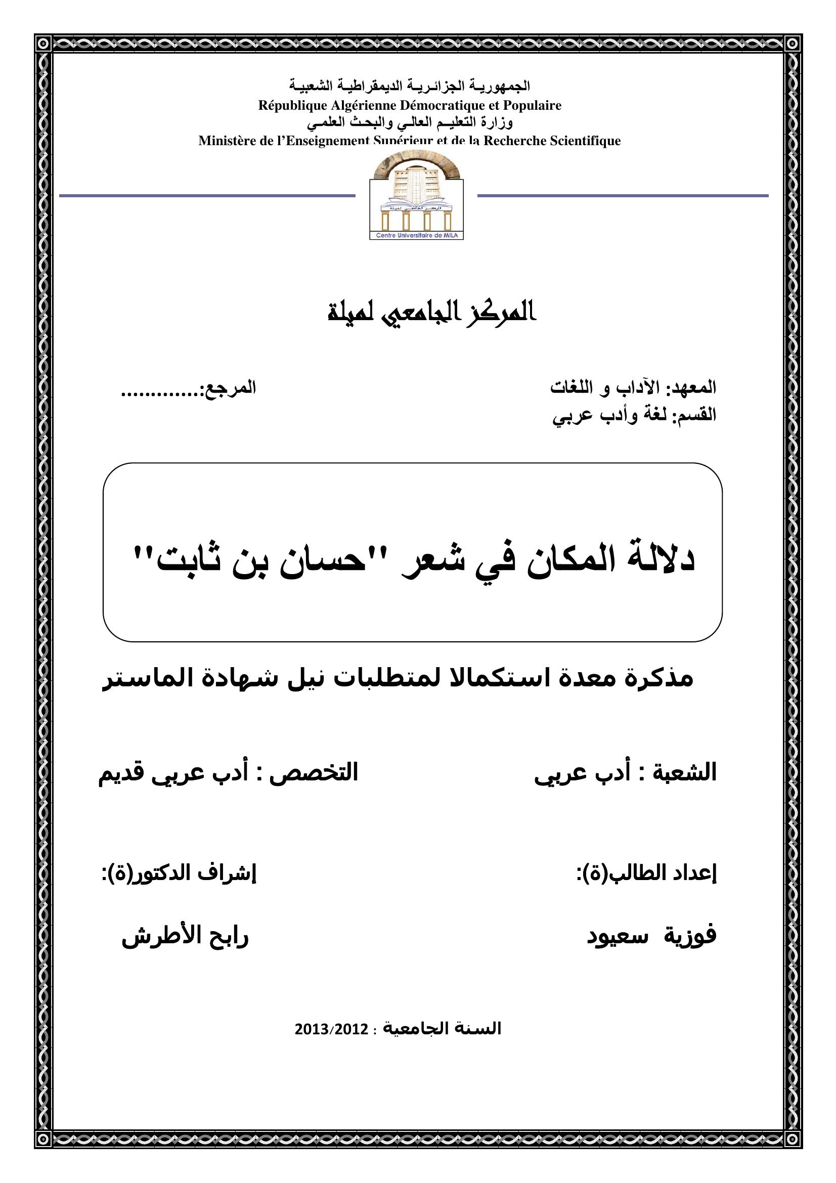 فوزية سعيود & الأطرش رابح( مشرفا) (2013). دلالية المكان في شعر ''حسان بن ثابث ''.