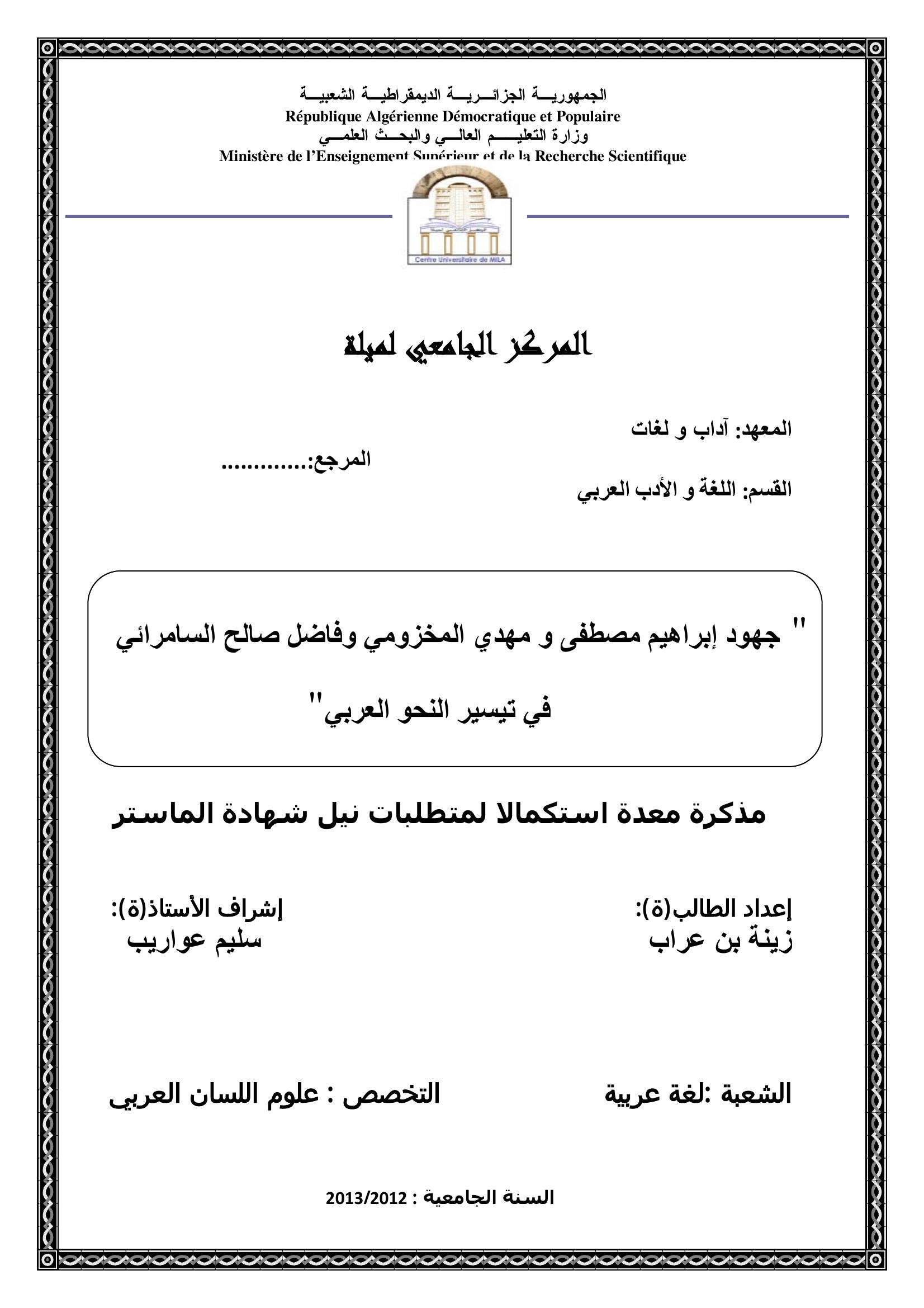 زينة بن عراب & عواريب سليم (مشرفا) (2013). ''جهود إبراهيم مصطفى ومهدي المخزومي وفاضل صالح السامرائي في تيسير النحو العربي ''.