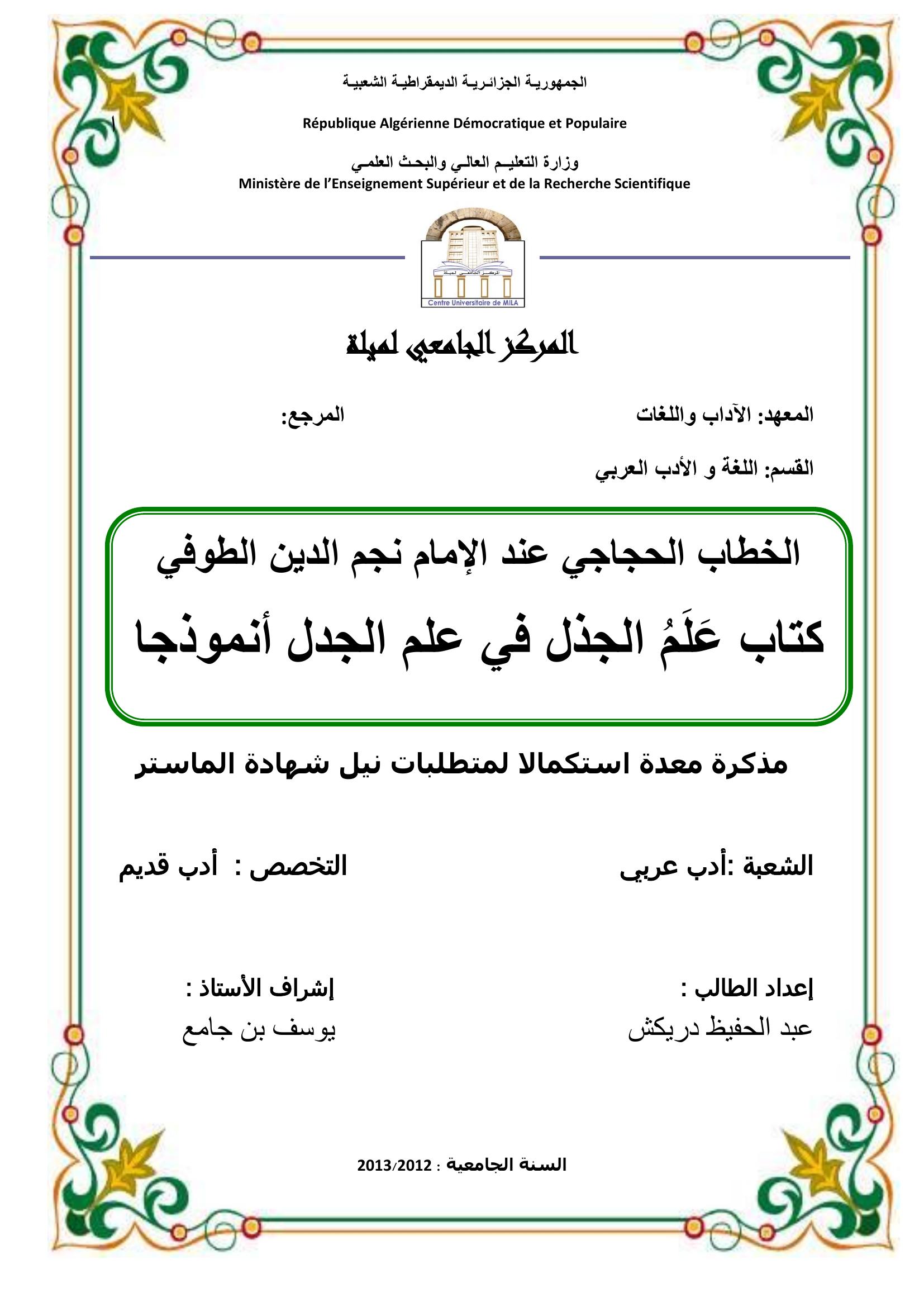 دريكش عبد الحفيظ & بن جامع يوسف (مشرفا) (2013). الخطاب الحجاجي عند الإمام نجم الدين الطوفي.