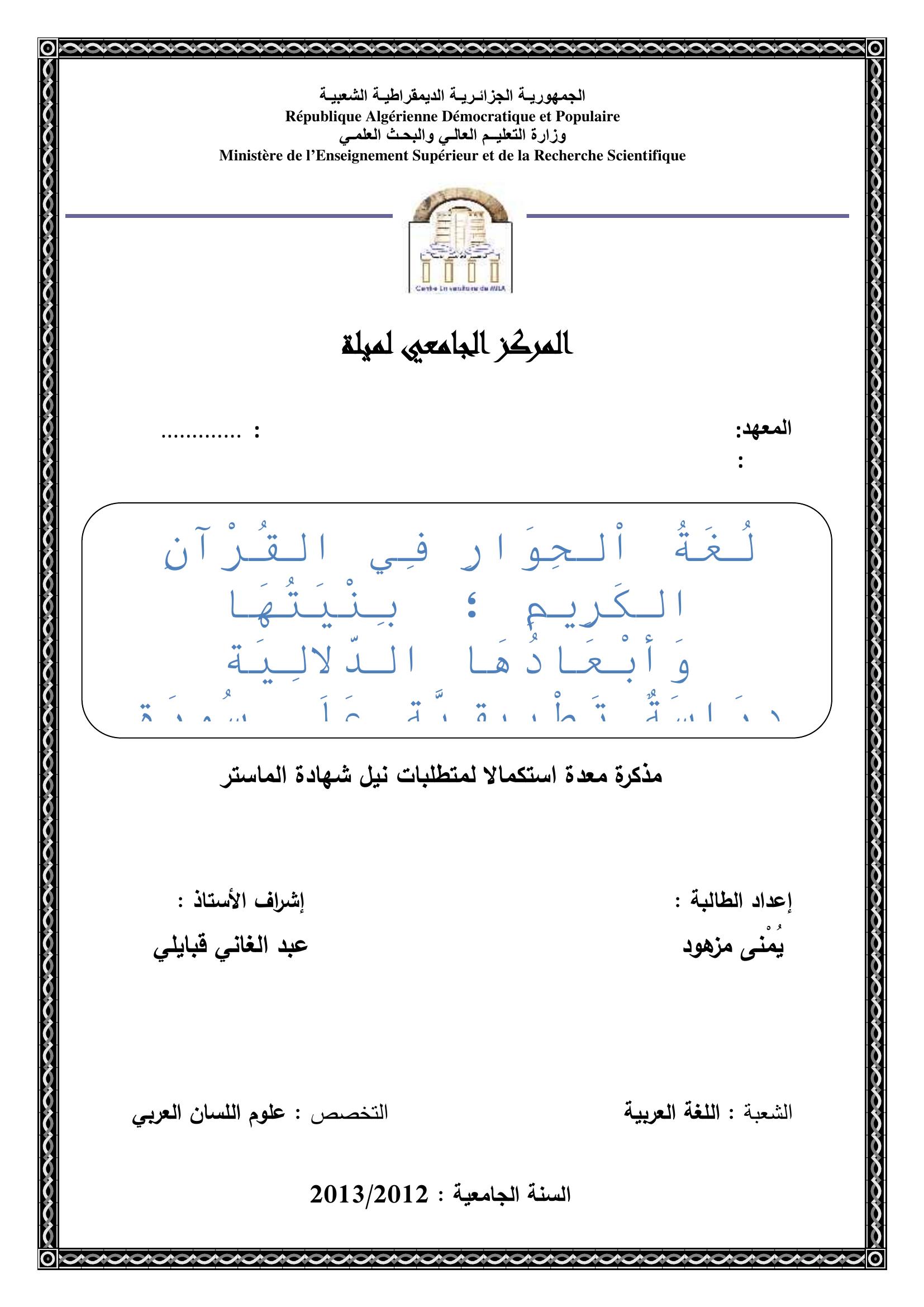 يمنى مزهود & قبايلي عبد الغاني (مشرفا) (2013). لغة الحوار في القرآن الكريم ؛بنيتها وأبعادها الدلالية دراسة تطبيقية في سورة البقرة.