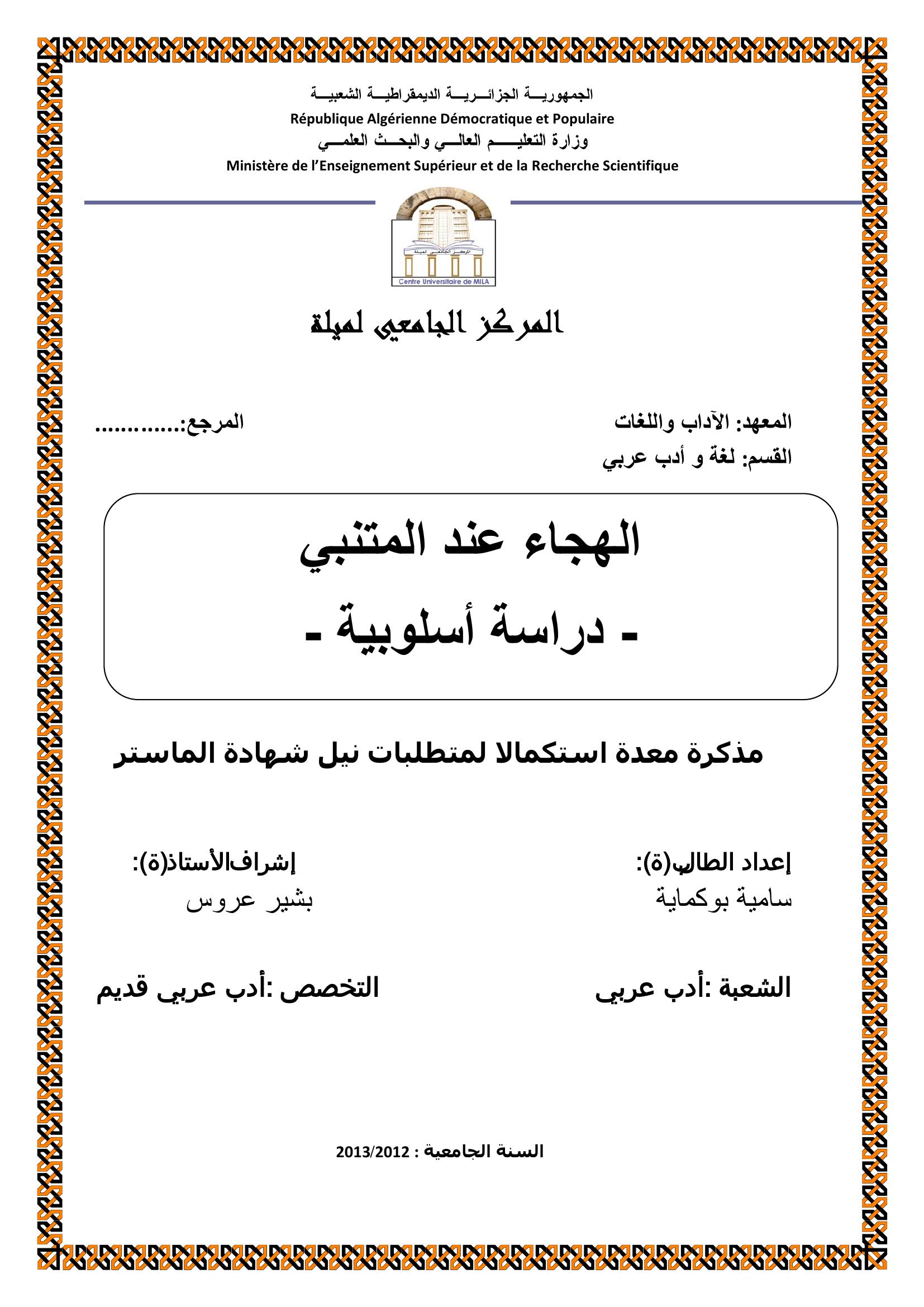 بوكماية سامية & عروس بشير(مشرفا) (2013). الهجاء عند المتنبي -دراسة أسلوبية-.
