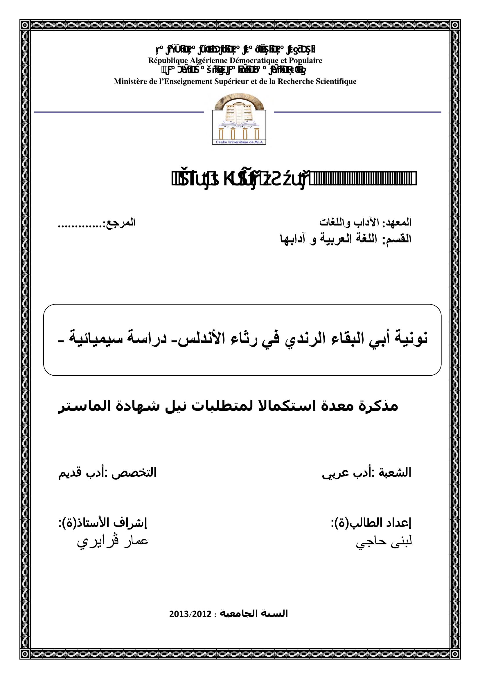 لبنى حاجي & قرايري عمار (مشرفا) (2013). نونية أبي البقاء الرندي في رثاء الأندلس -دراسة سيميائية -.
