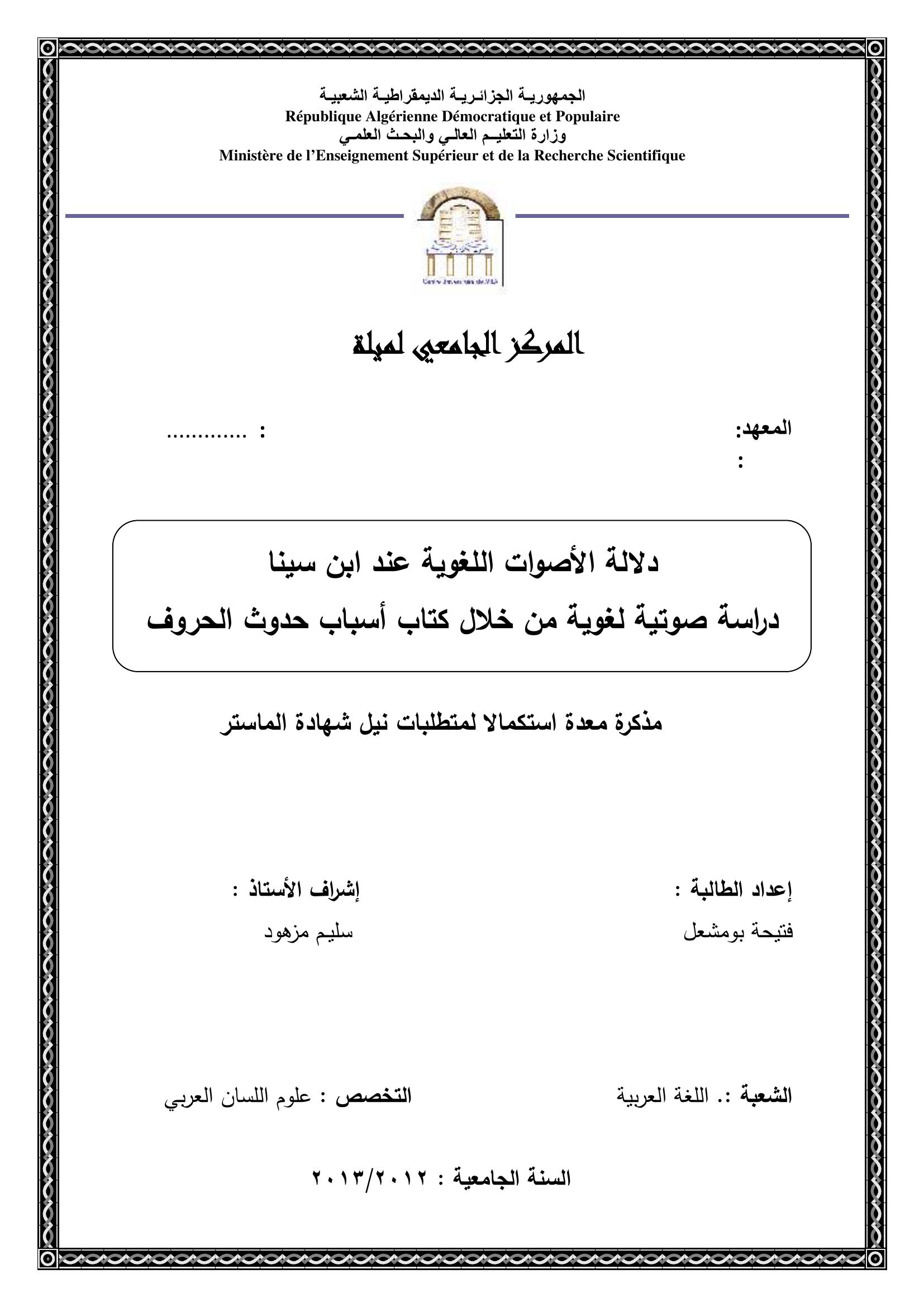 بومشعل فتيحة & مزهود سليم (مشرفا) (2013). دلالة الأصوات اللغوية عند ابن سينا :دراسة صوتية لغوية من خلال كتاب أسباب حدوث الحروف.