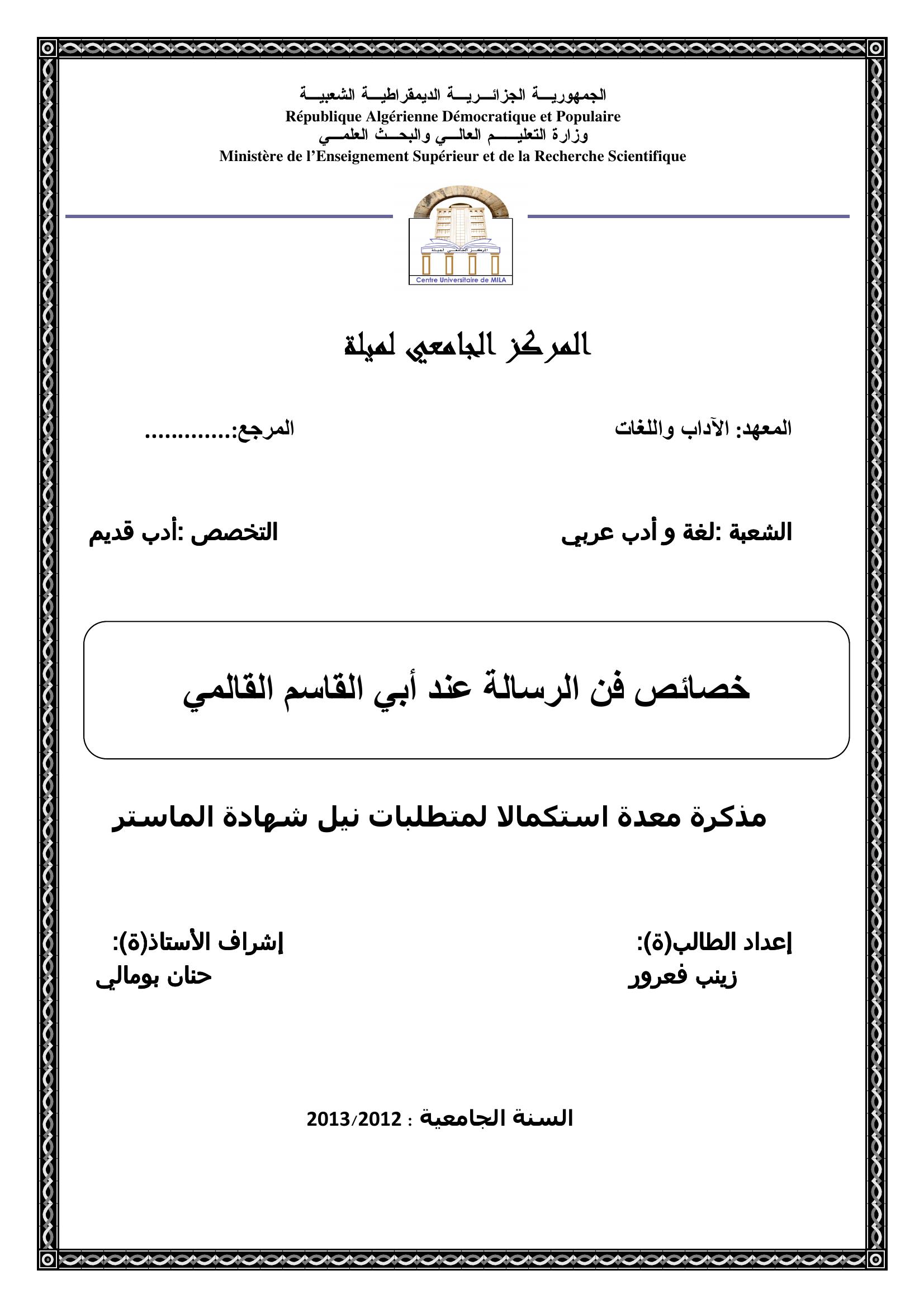 زينب فعرور & بومالي حنان (2013). خصائص فن الرسالة عند أبي القاسم القالمي.