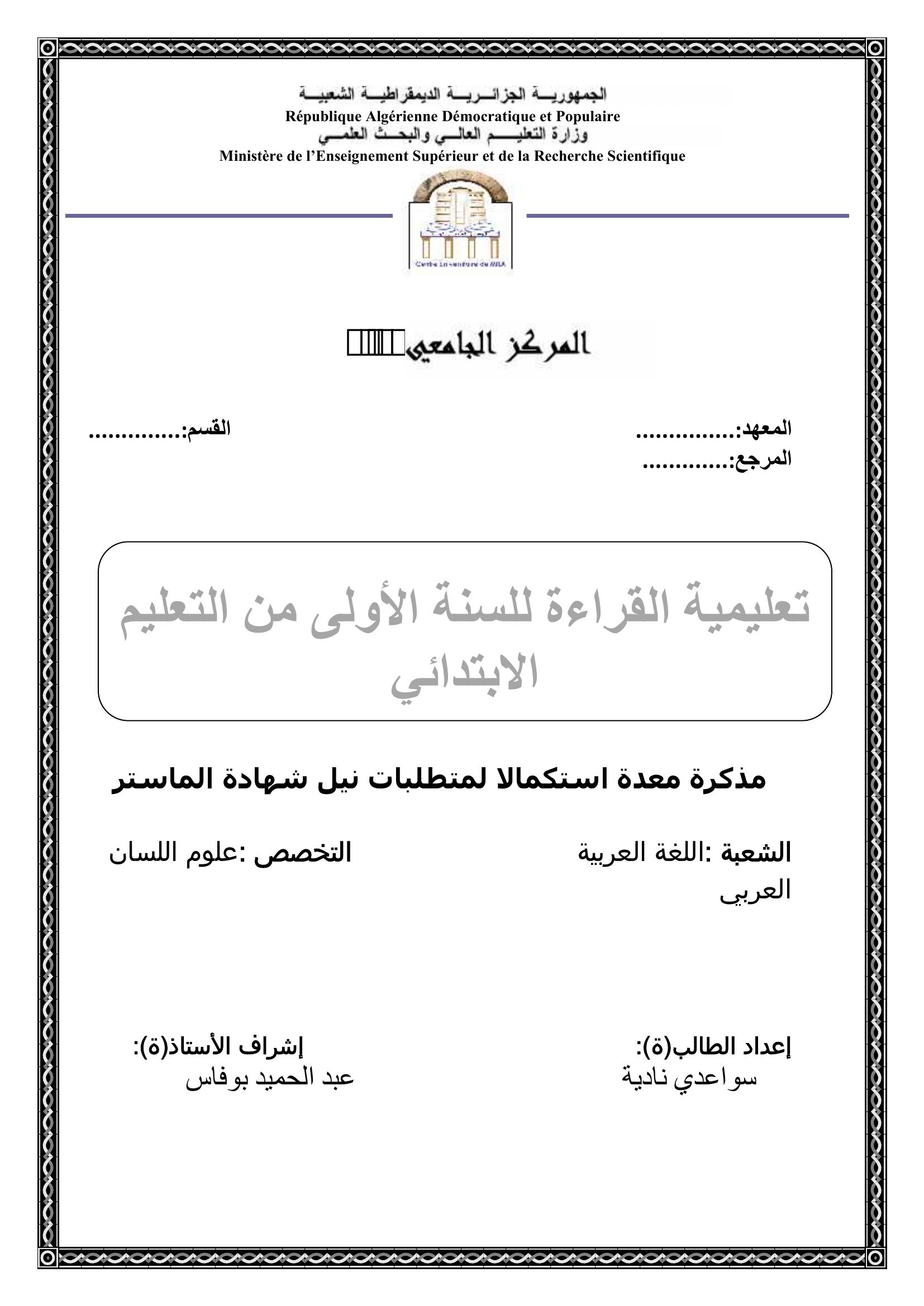 نادية سواعدي & بوفاس عبد الحميد(مشرفا) (2013). تعليمية القراءة للسنة الأولى من التعليم الابتدائي.