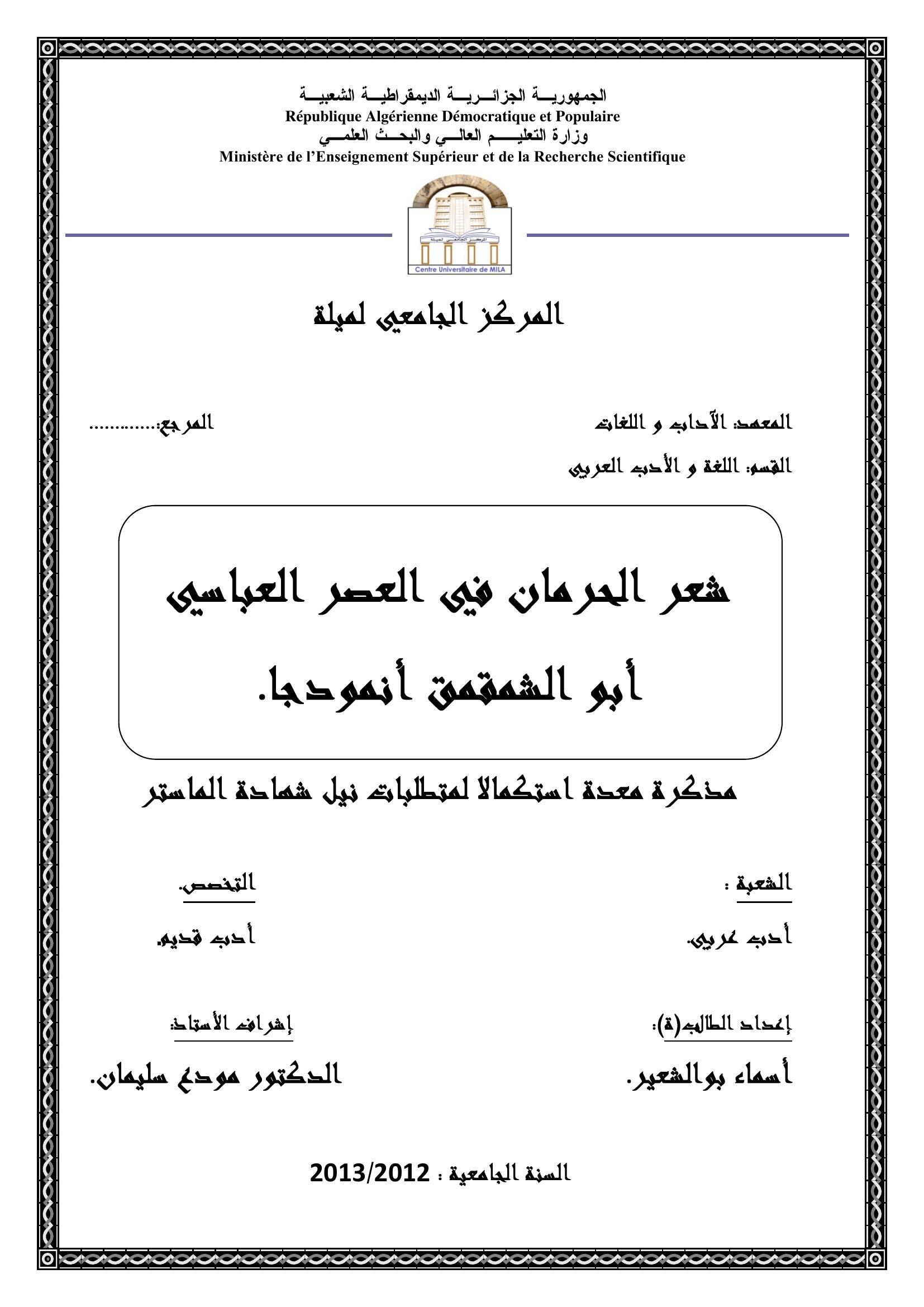 بوالشعير أسماء & مودع سليمان (مشرفا) (2013). شعر الحرمان في العصر العباسي أبو الشمقمق أنموذجا..