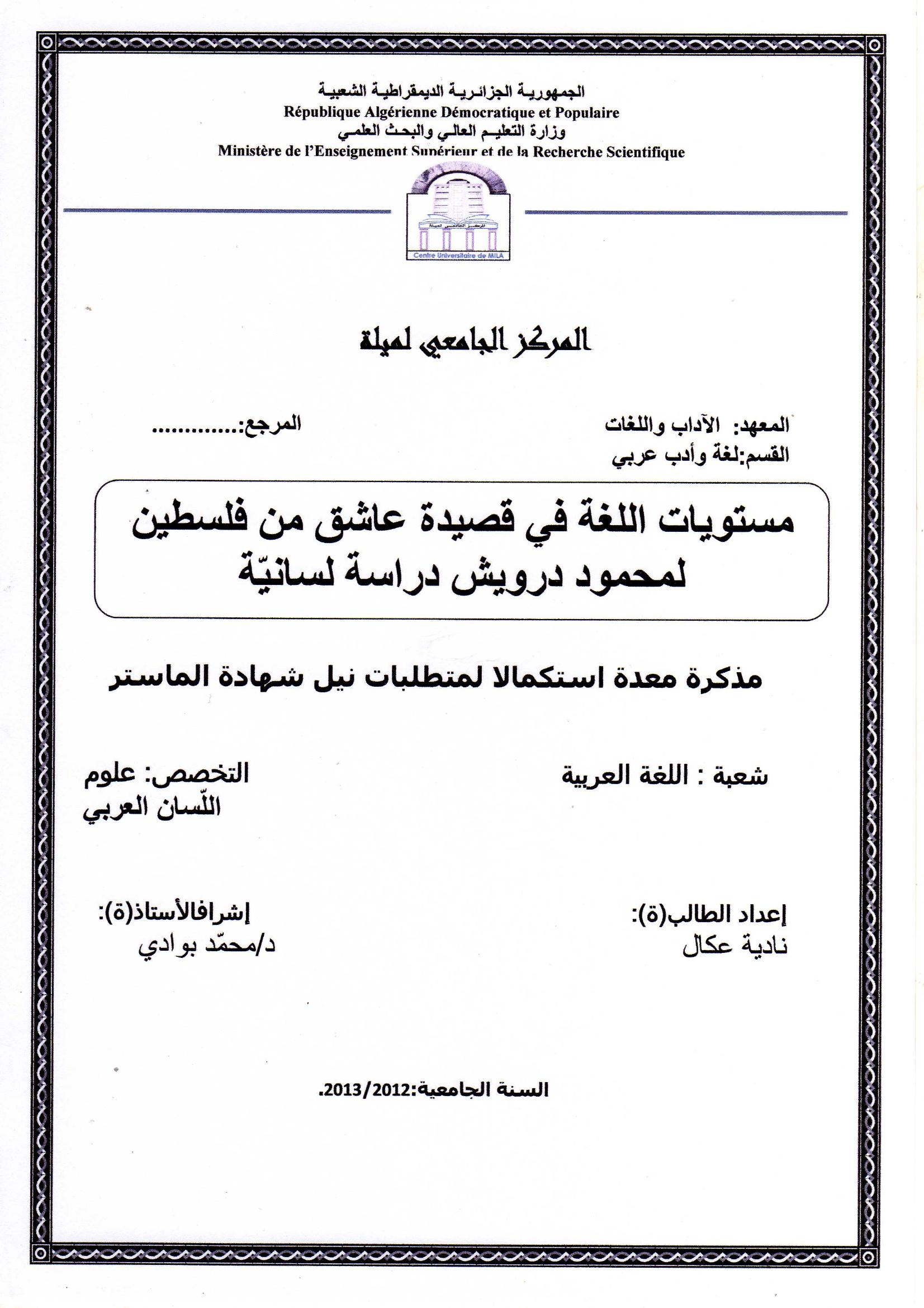 عكال نادية & بوادي محمد (مشرفا) (2013). مستويات اللغة في قصيدة عاشق من فلسطين لمحمود درويش دراسة لسانية.