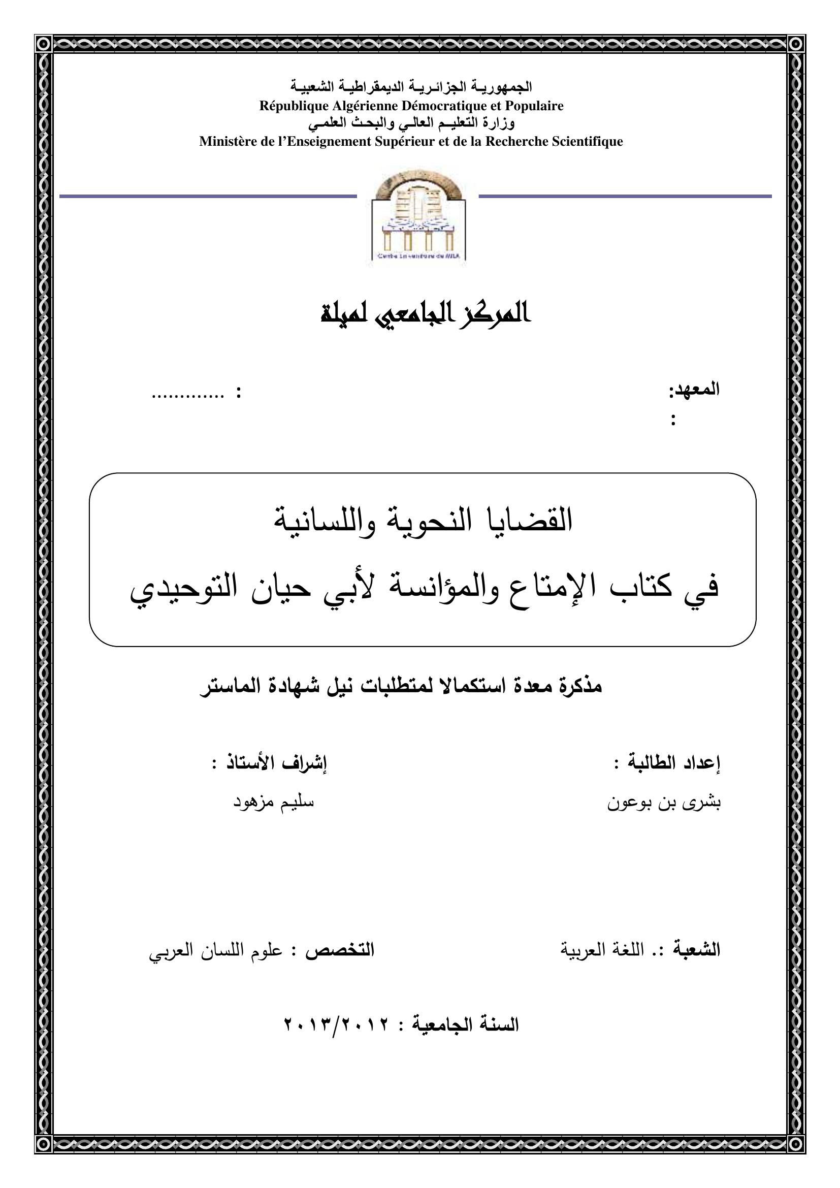بن بوعون بشرى & مزهود سليم (مشرفا) (2013). القضايا النحوية واللسانية في كتاب الإمتاع والمؤانسة لأبي حيان التوحيدي.