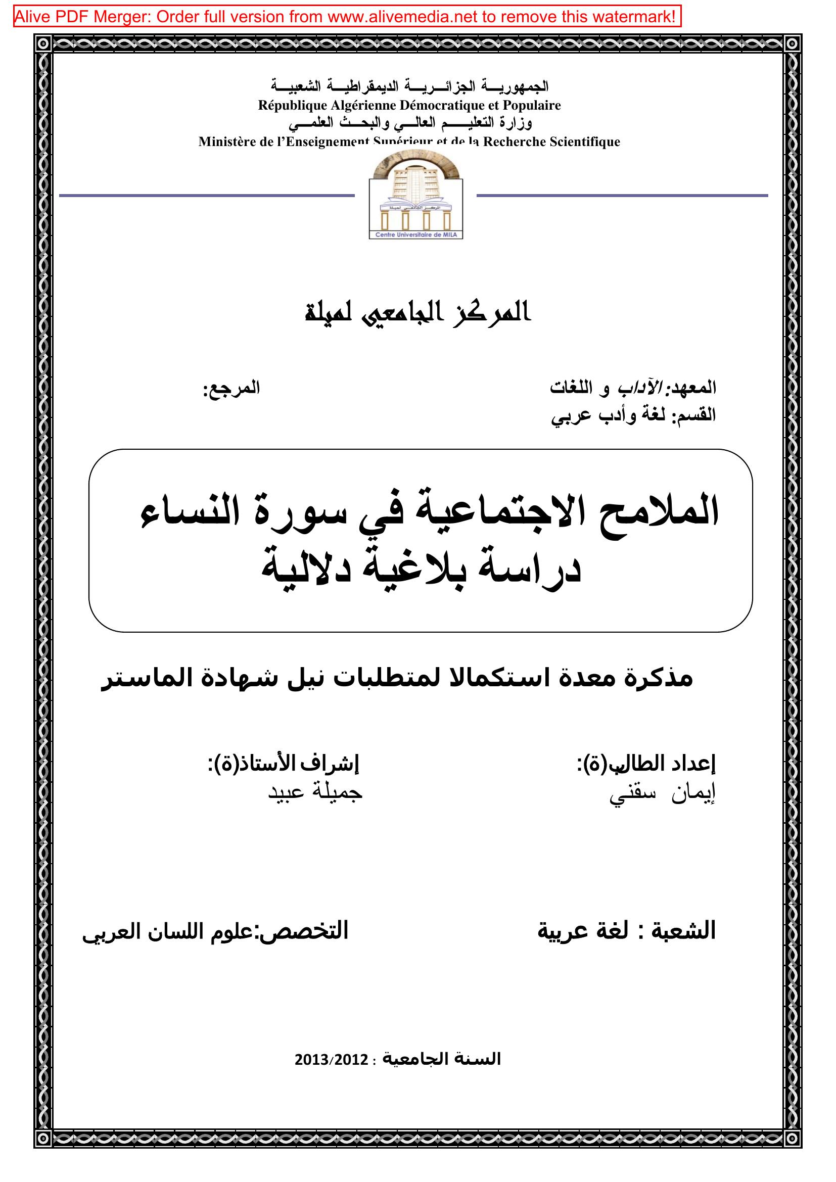 سقني إبمان & عبيد جميلة (مشرفا) (2013). الملامح الإجتماعية في سورة النساء دراسة بلاغية دلالية.