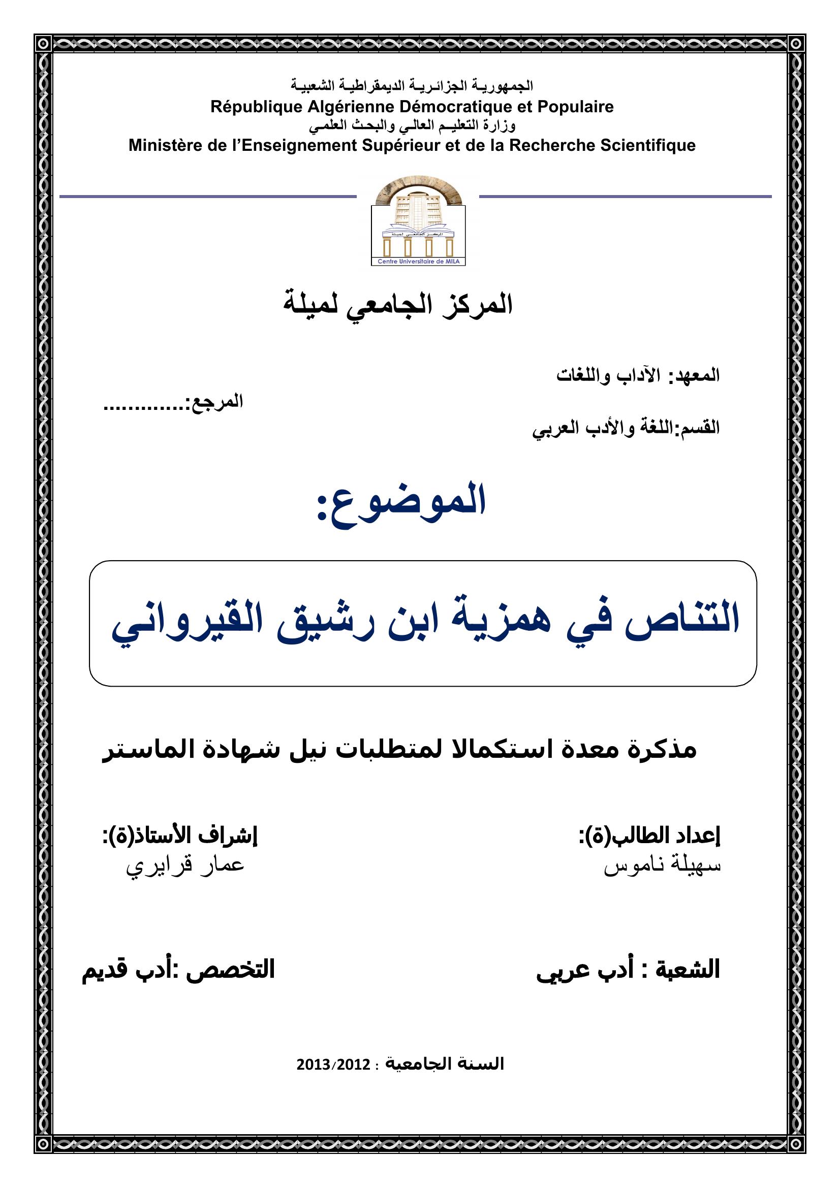 ناموس سهيلة & قرايري عمار (مشرفا) (2013). التناص في همزية ابن رشيق القيرواني.