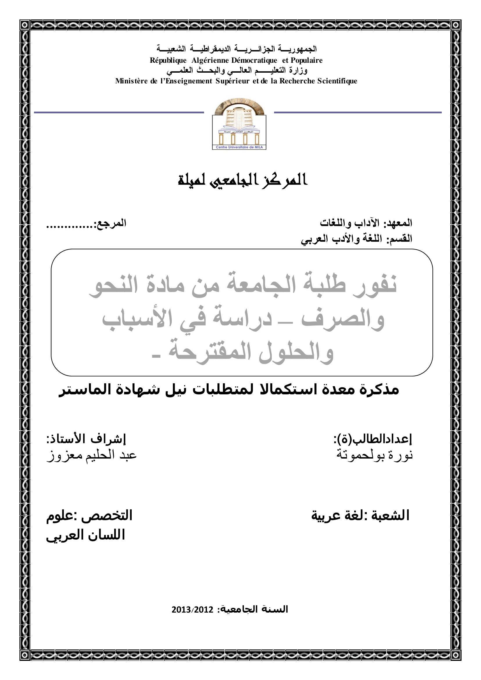 بولحموتة نورة & معزوز عبد الحليم (مشرفا) (2013). نفور طلبة الجامعة من مادة النحو والصرف - دراسة في الأسباب والبدائل المقترحة -.