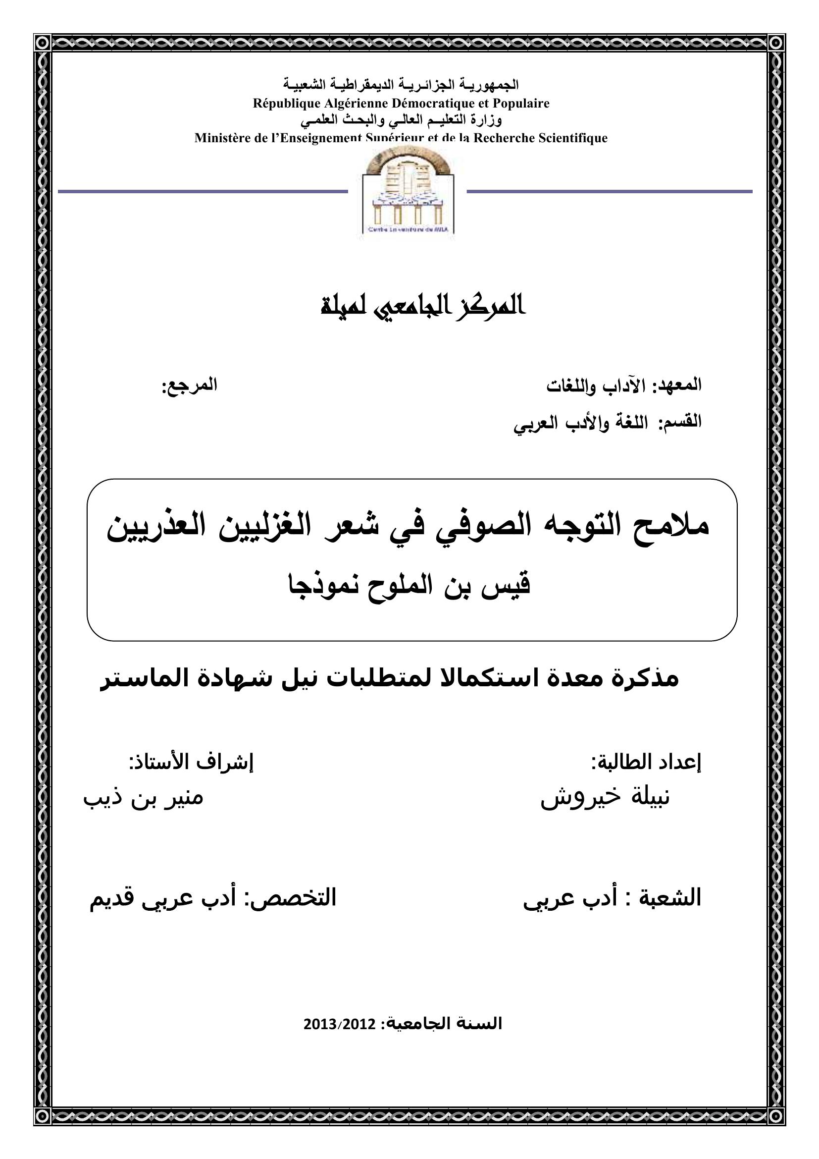 خيروش نبيلة & بن الذيب منير( مشرفا) (2013). ملامح التوجه الصوفي في شغر الغزليين العذريين قيس بن الملوح نموذجا.