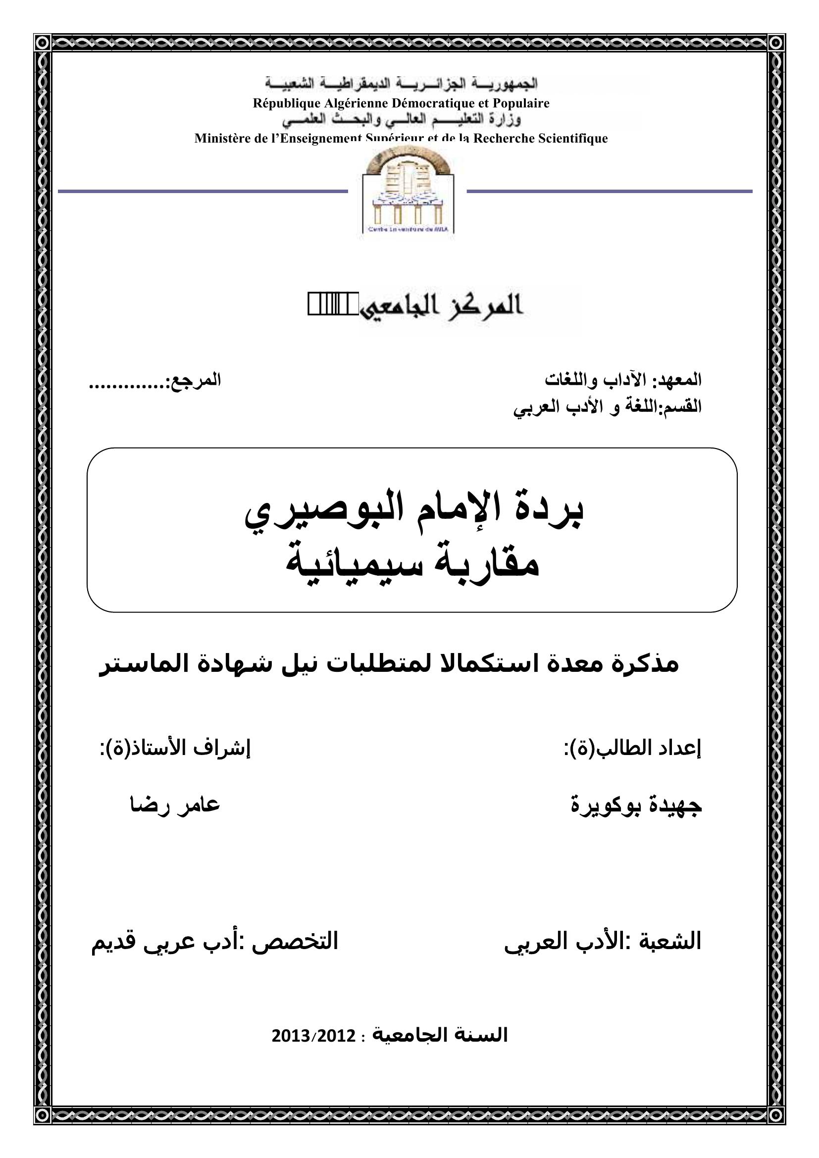 بوكويرة جهيدة & عامر رضا (مشرفا) (2013). بردة الإمام البوصيري مقاربة سيميائية.