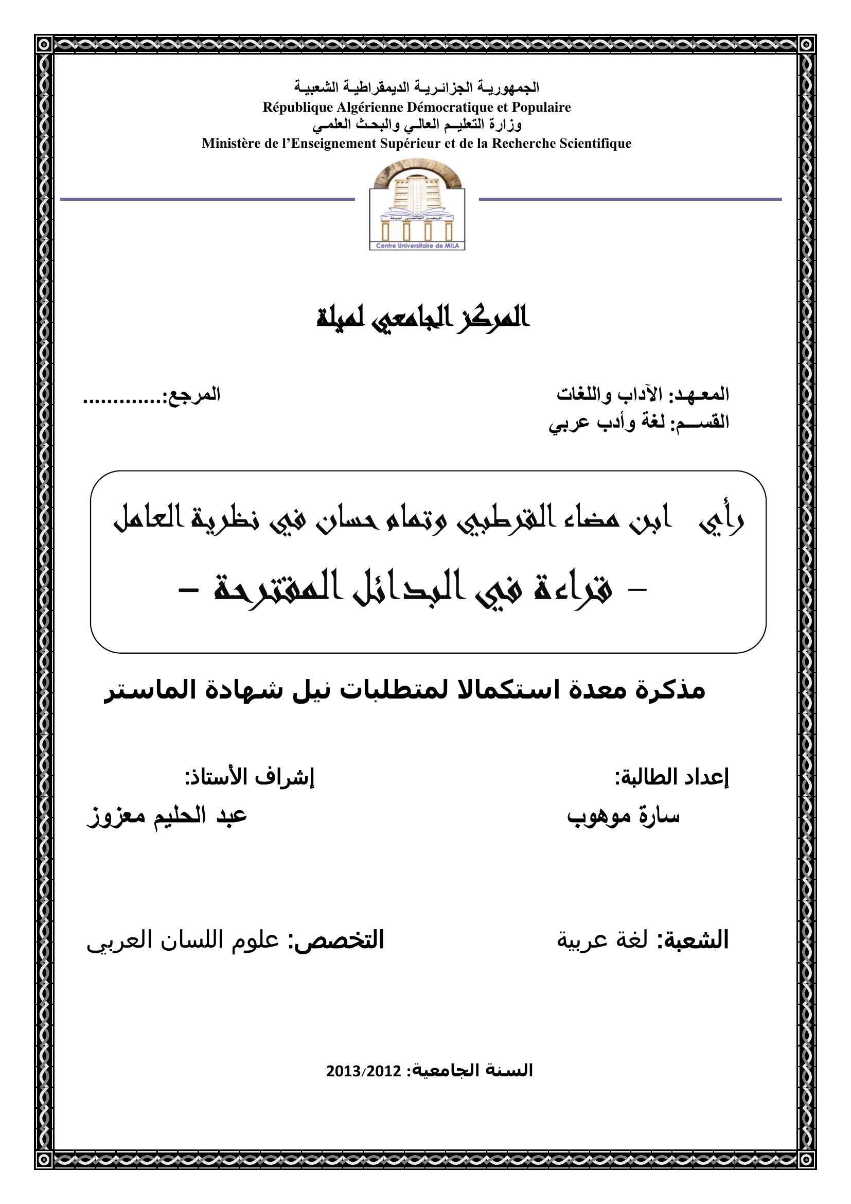 موهوب سارة & معزوز عبد الحليم (مشرفا) (2013). رأي ابن مضاء القرطبي وتمام حسان في نظرية العامل -قراءة في البدائل المقترحة.