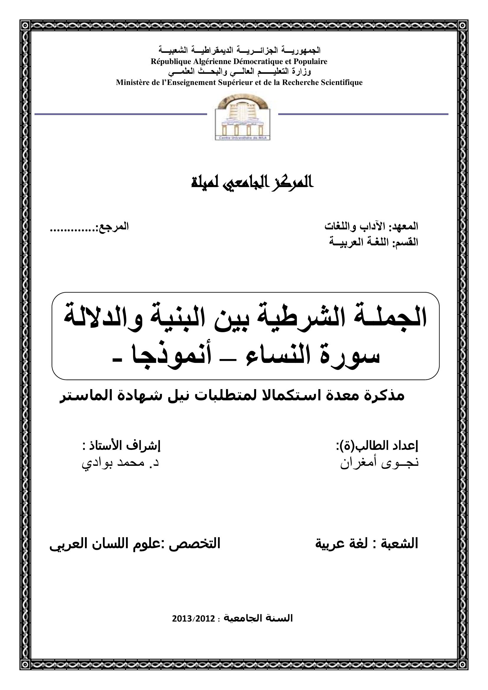 أمغران نجوى & بوادي محمد (مشرفا) (2013). الجملة الشرطية بين البنية والدلالة سورة النساء -أنموذجا.