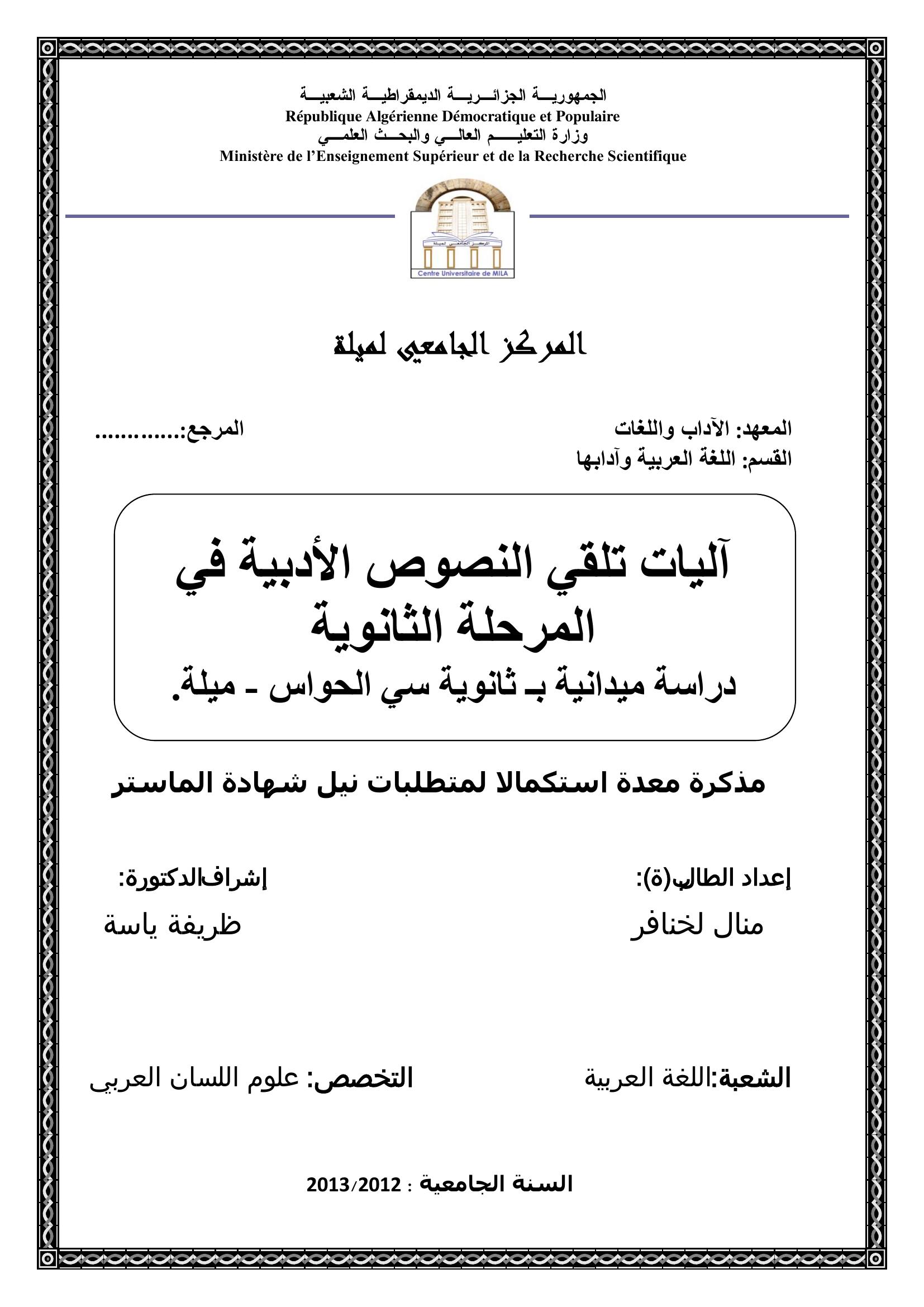 لخنافر منال & ياسة ظريفة (مشرفا) (2013). آليات تلقي النصوص الأدبية في المرحلة الثانوية :-السنة الثالثة ثانوي أنموذجا : دراسة ميدانية بـ ثانوية سي الحواس -ميلة..