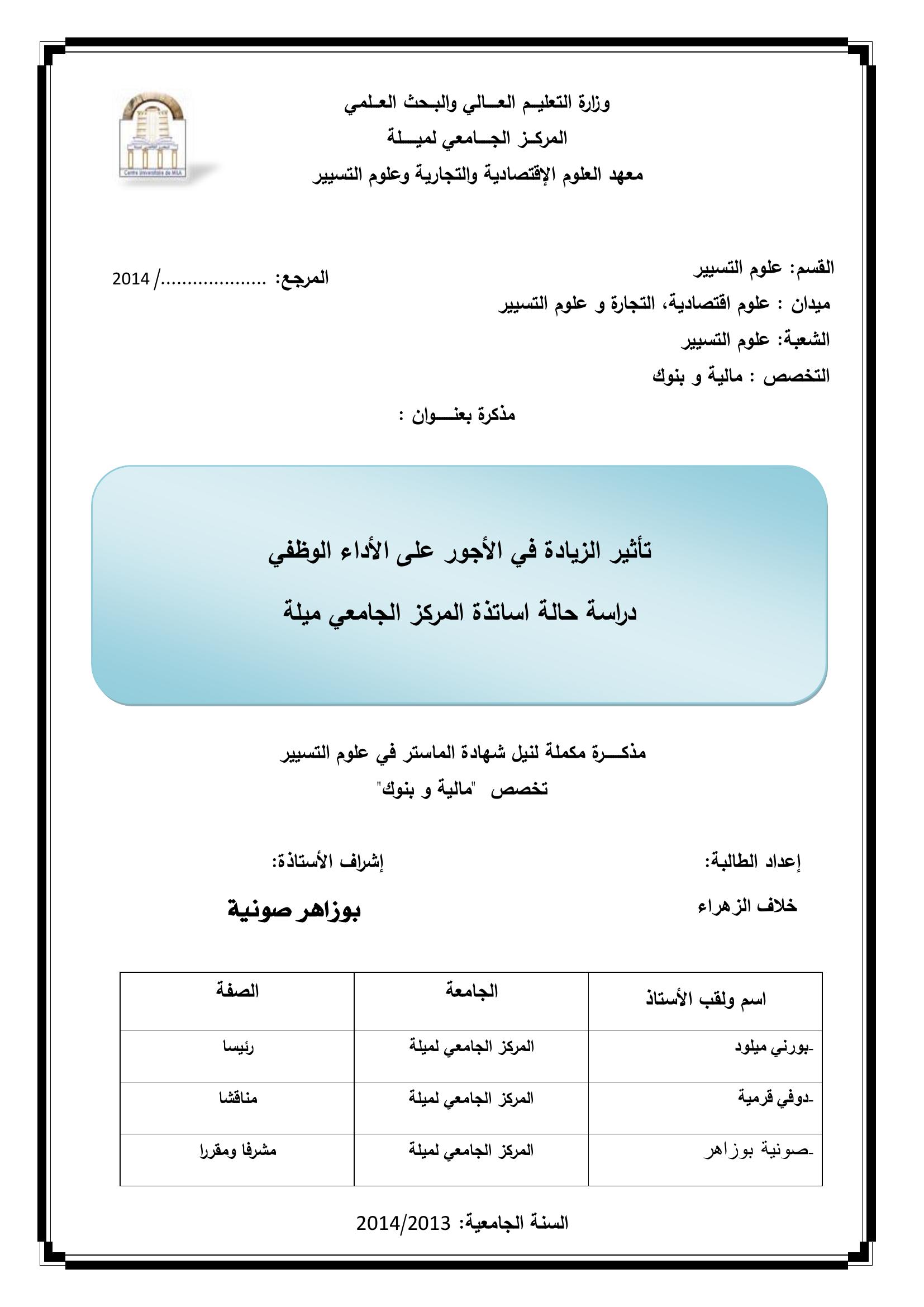 خلاف الزهراء & ،برني ميلود(رئيسا)، دوفي قرمية(مناقشا)، صونية بوزاهر(مشرفا ومقررا) (2014). تأثير الزيادة في الأجور على الآداء الوظيفي دراسة حالة البنك المركزي السوداني.