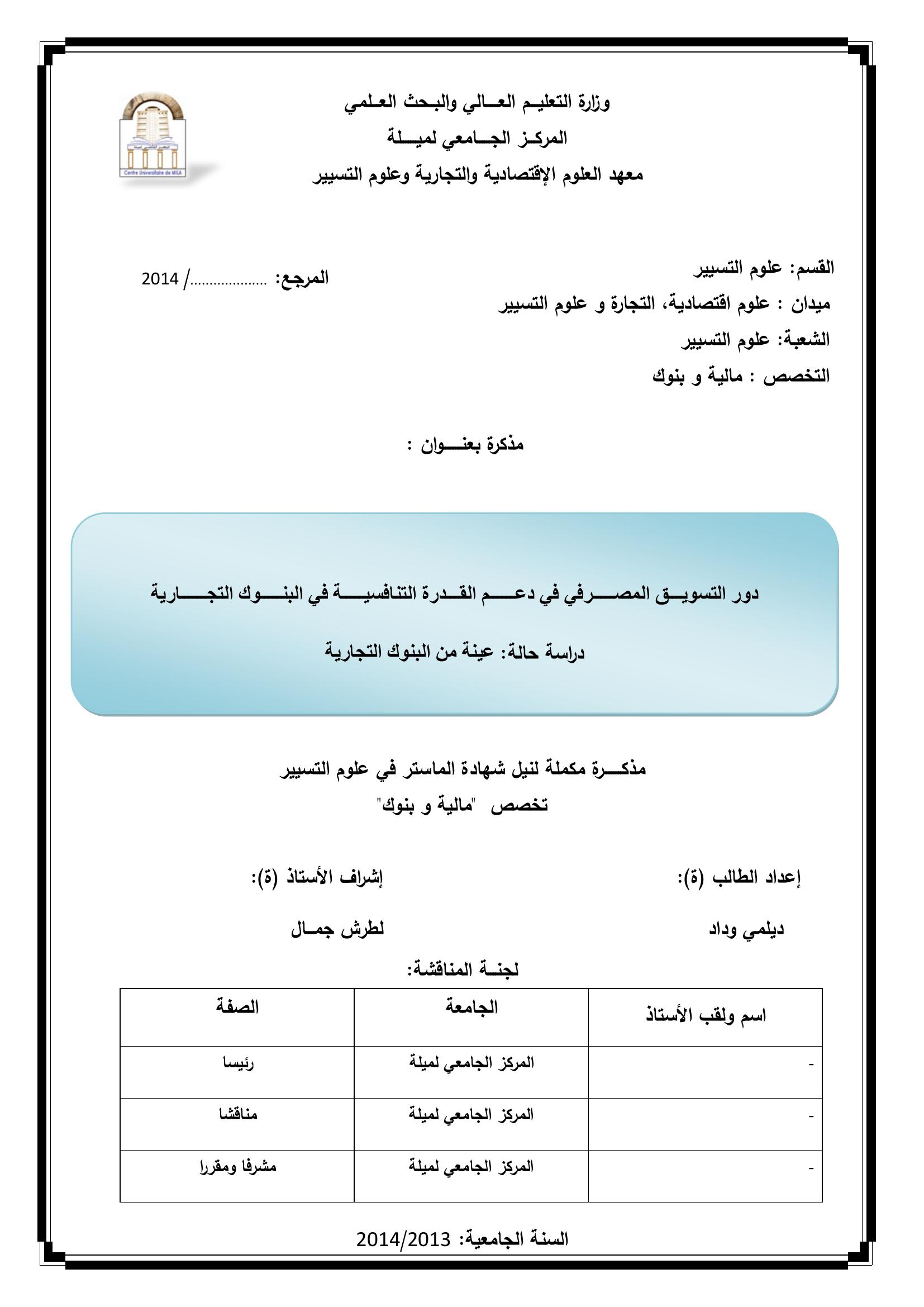 ديلمي وداد & لطرش جمال(مشرفا) (2014). دور التسويق المصرفي في دعم القدرة التنافسية في البنوك التجارية دراسة حالة عينة من البنوك التجارية.
