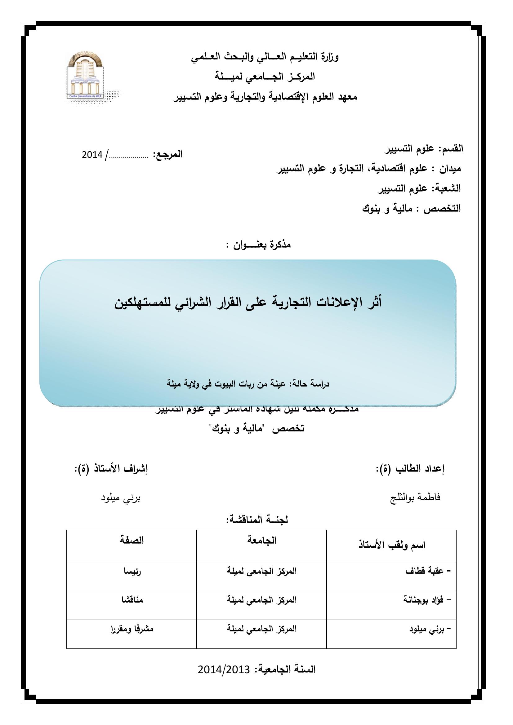 بوالثلج فاطمة & ،عقبة قطاف(رئيسا)،فؤاد بوجنانة(مناقشا)،برني ميلود(مشرفا ومقررا) (2014). أثر الإعلانات التجارية على القرار الشرائي للمستهلكين دراسة حالة عينة من ربات البيوت في ولاية ميلة.