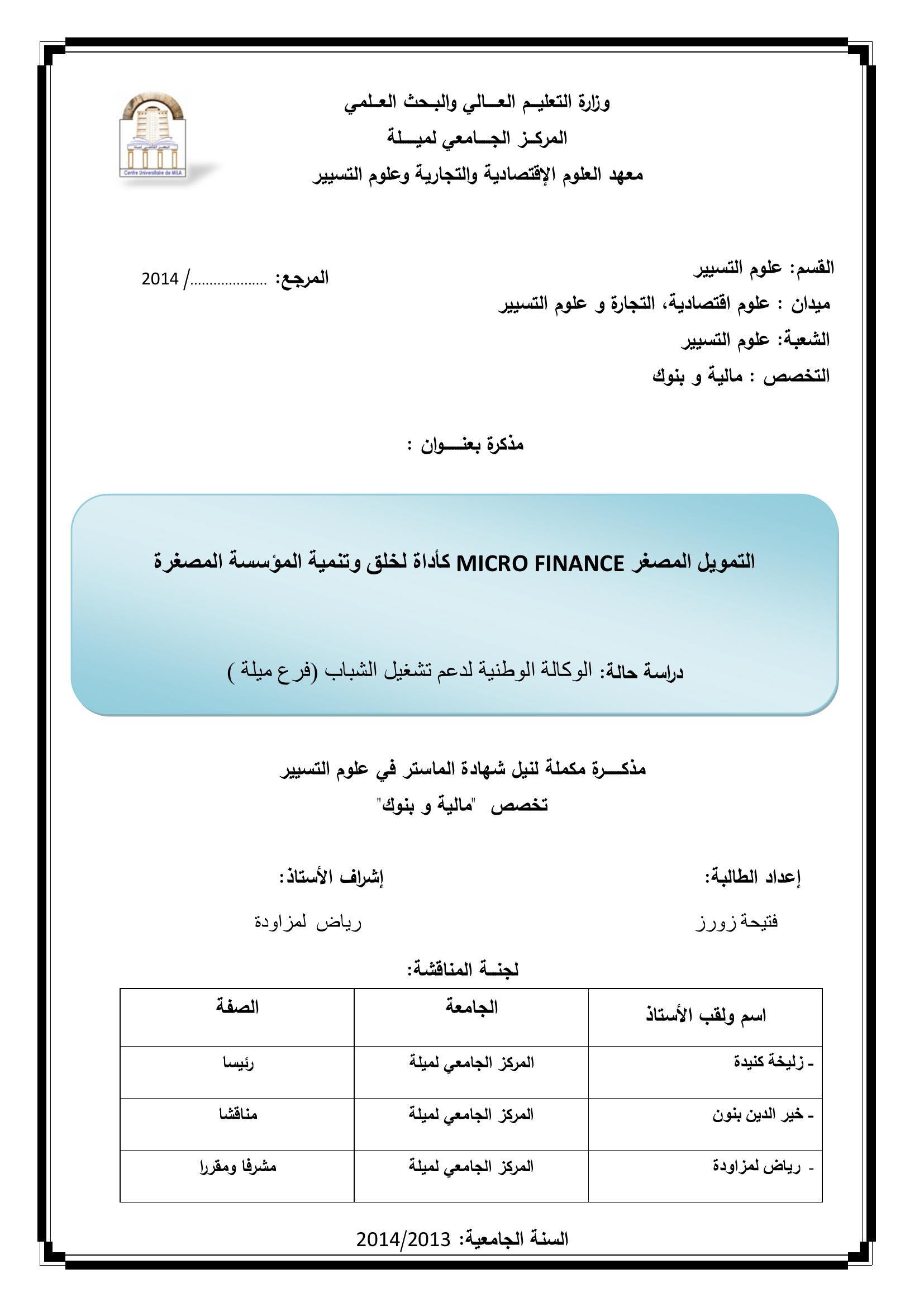 زورز فتيحة & ،كنيدة زليخة(رئيسا)، لطرش جمال(مناقشا)، بوالريحان(مشرفا ومقررا) (2014). التمويل المصغر micro finance كأداة لخلق وتنمية المؤسسة المصغرة دراسة حالة الوكالة الوطنية لدعم تشغيل الشباب-فرع ميلة -.