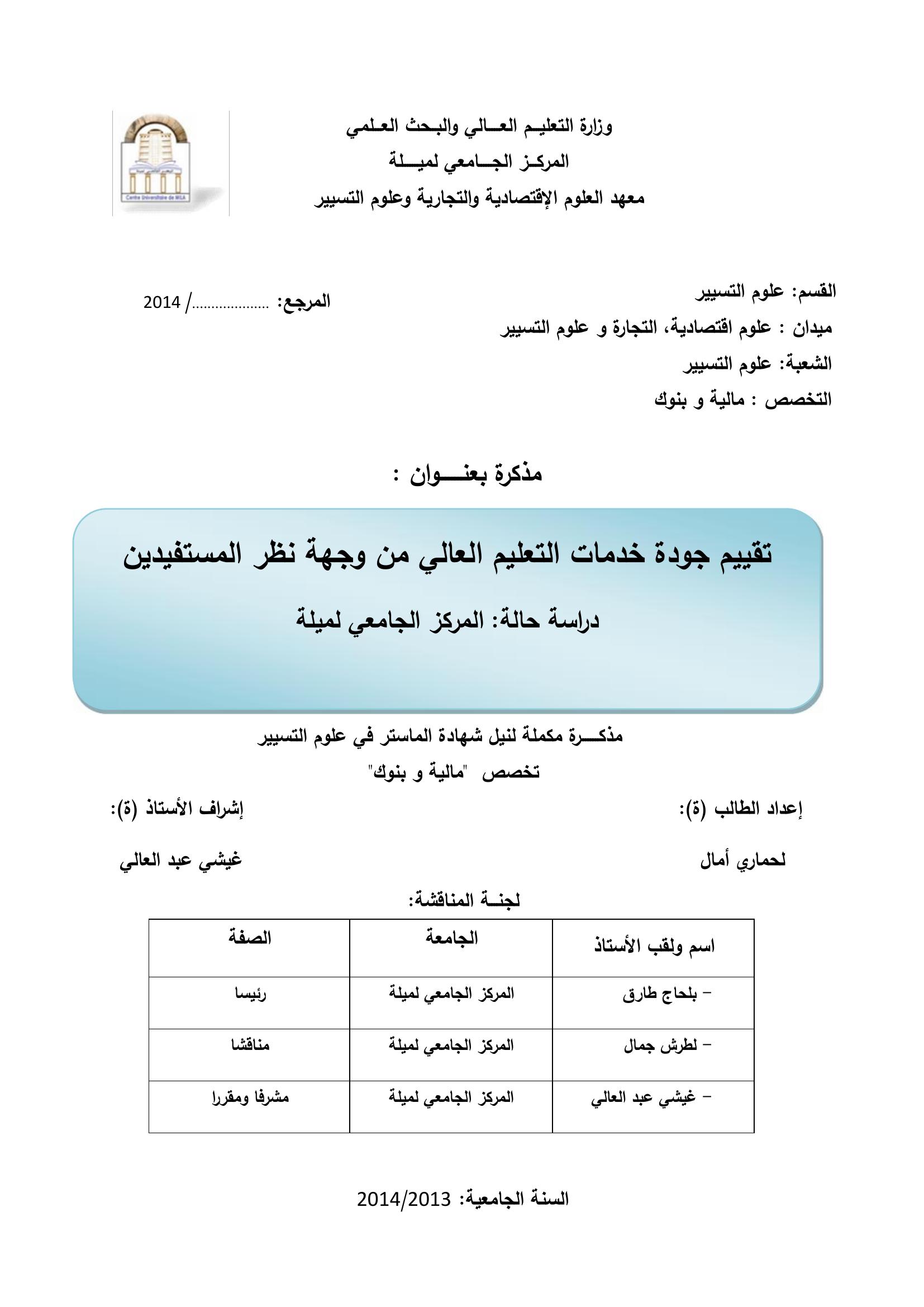 لحماري أمال & ،بلحاج طارق(رئيسا)، لطرش جمال(مناقشا)، غيش عبد العالي(مشرفا ومقررا) (2014). تقييم جودة خدمات التعليم العالي من وجهة نظر المستفيدين دراسة حالة المركز الجامعي لميلة.