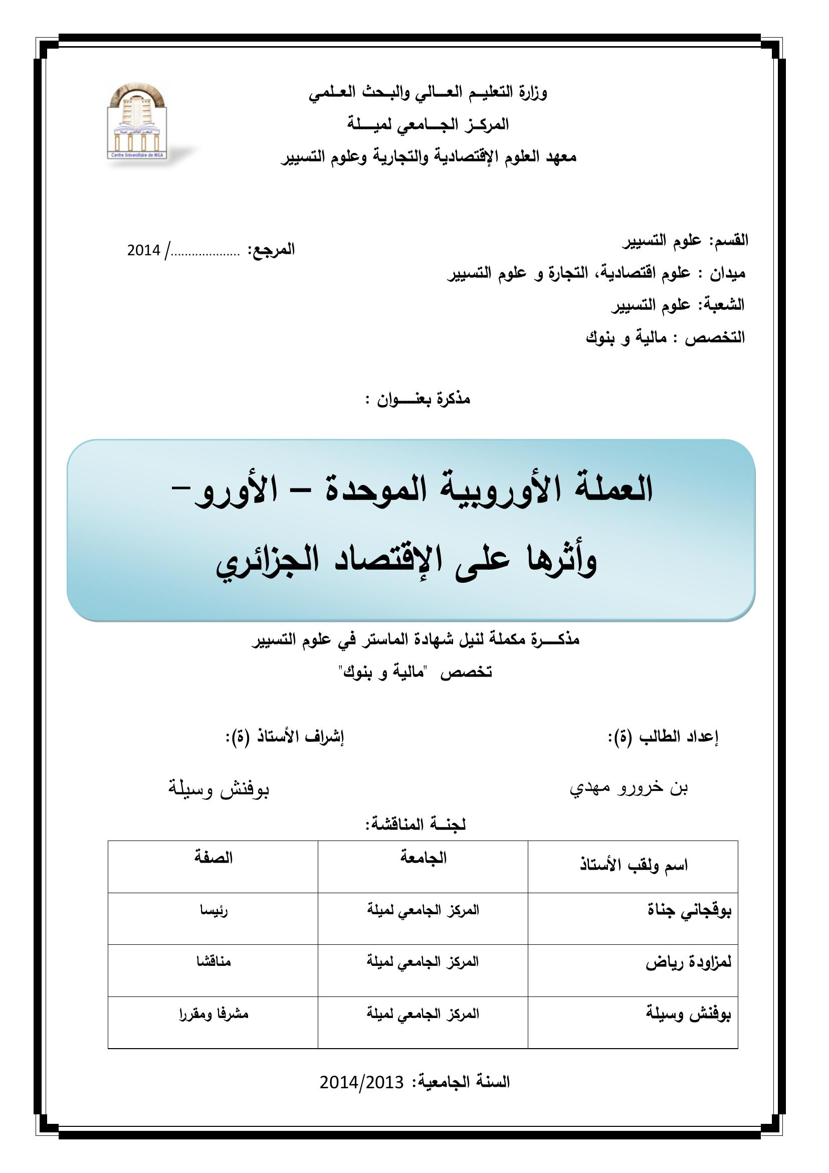 بن خرورو مهدي & ،بوقجاني جنات(زئيسا)، لمزاودة رياض(مناقشا)،بوفنش وسيلة وسيلة(مشرفا ومقررا) (2014). العملة الأوروبية الموحدة - الأورو - وأثرها على الاقتصاد الجزائري.