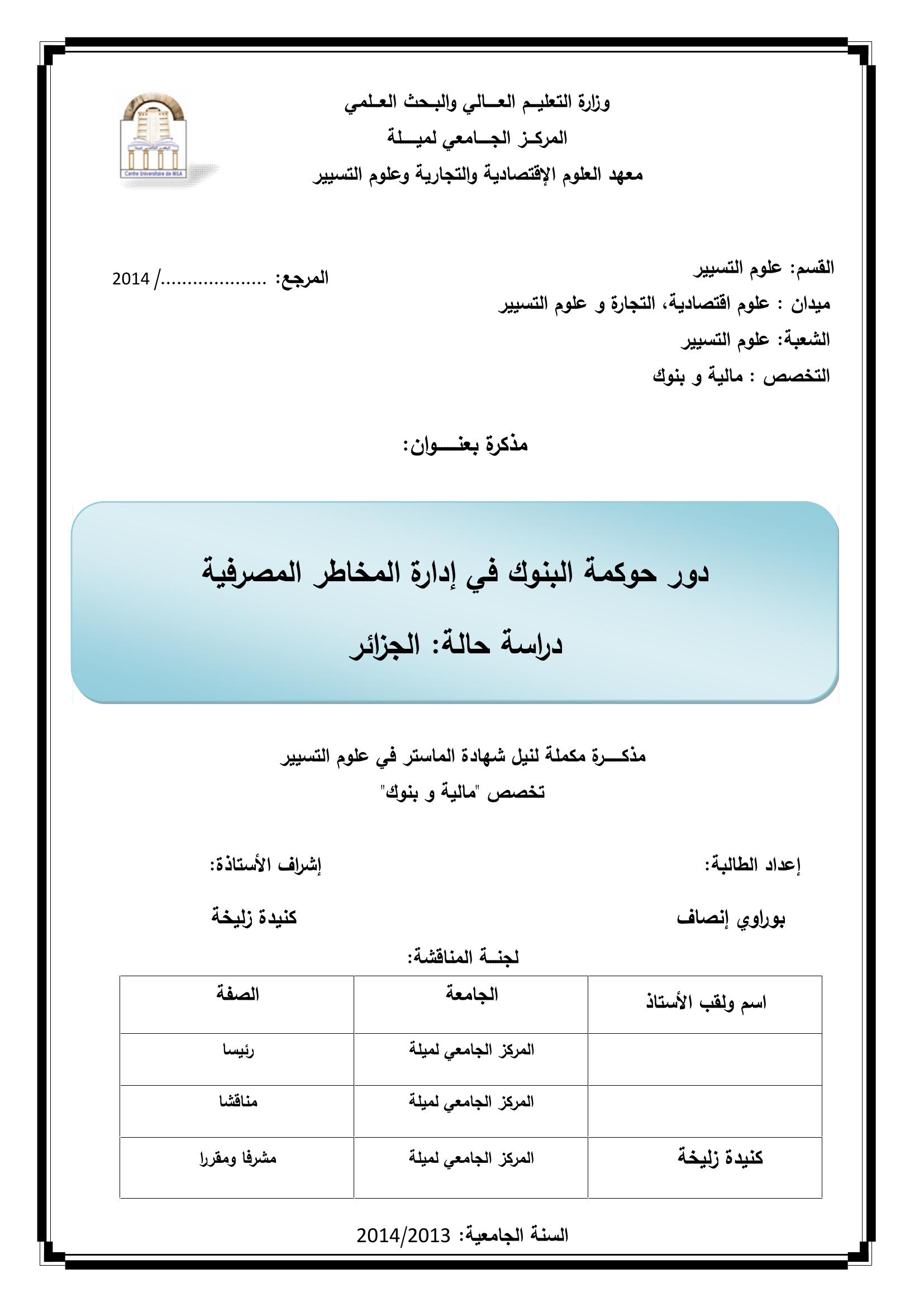بوراوي إنصاف & كنيدة زليخة (مشرفا) (2014). دور حوكمة البنوك في إدارة المخاطر المصرفية دراسة حالة الجزائر.
