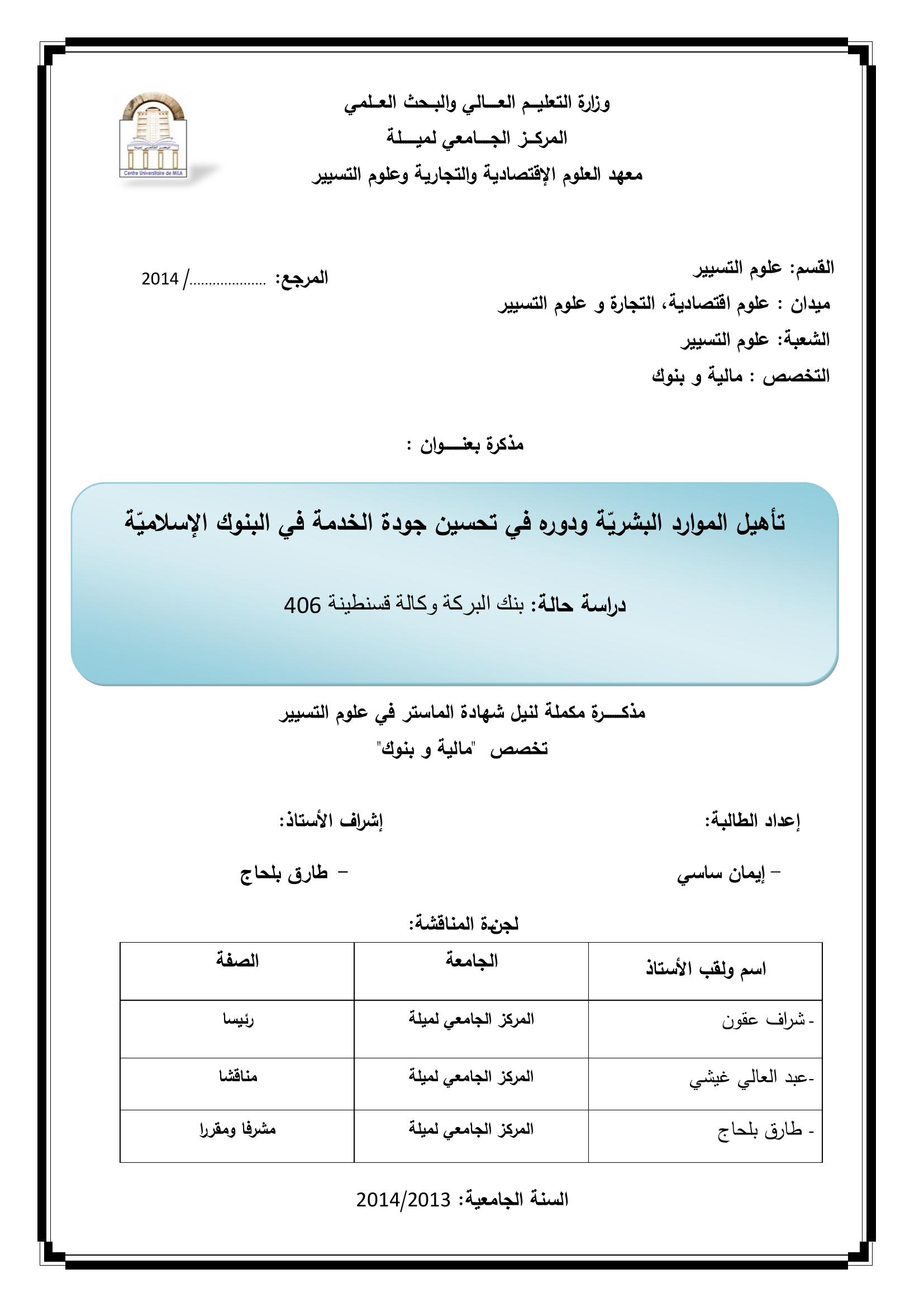 تأهيل الموارد البشرية ودوره في تحسين جودة الخدمة في البنوك الإسلامية دراسة حالة بنك البركة وكالة قسنطينة406
