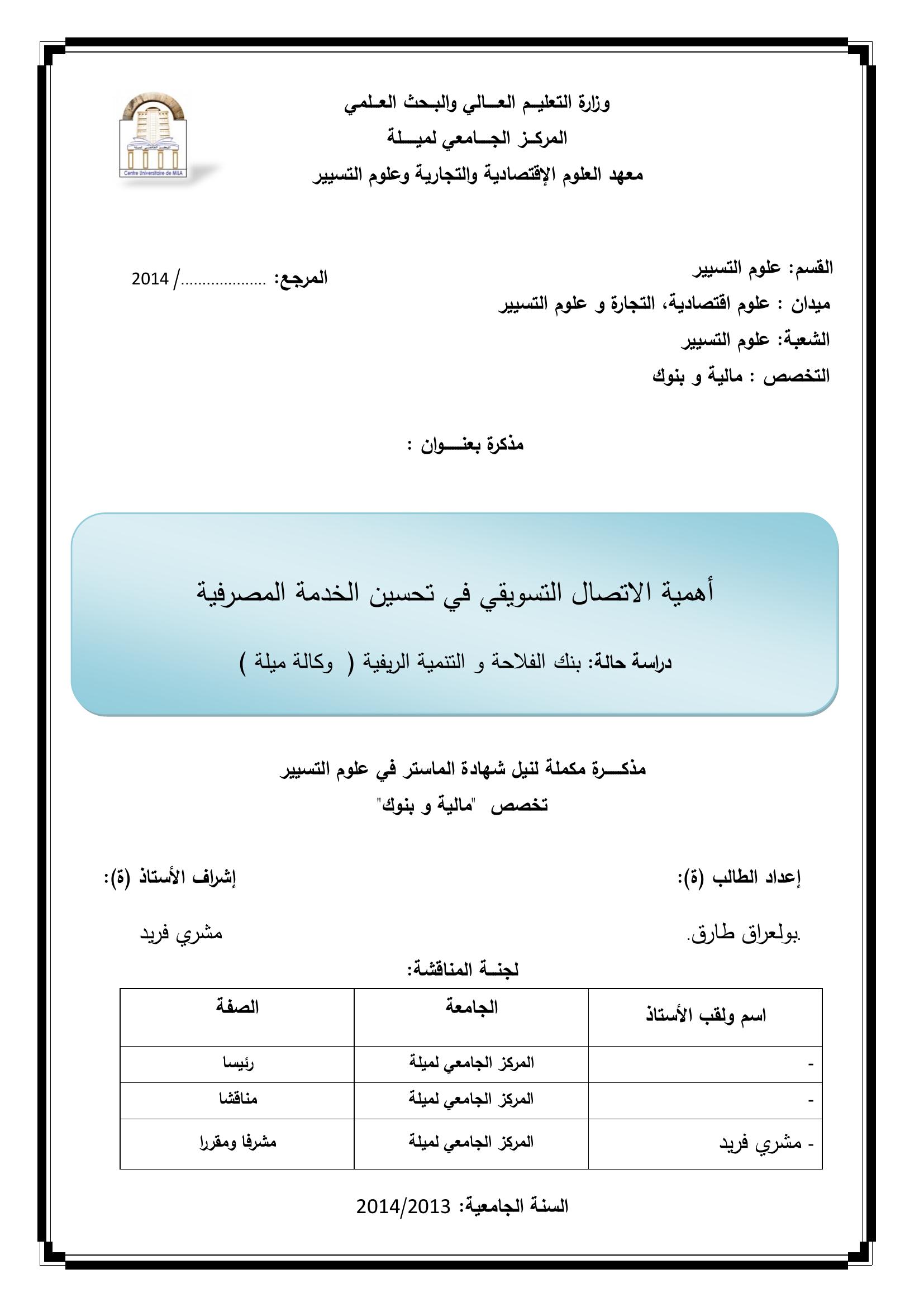 بولعراق طارق & مشري فريد(مشرفا) (2014). أهمية الاتصال التسويقي في تحسين الخدمة المصرفية دراسة حالة بنك الفلاحة والتنمية الريفية -وكالة ميلة -.