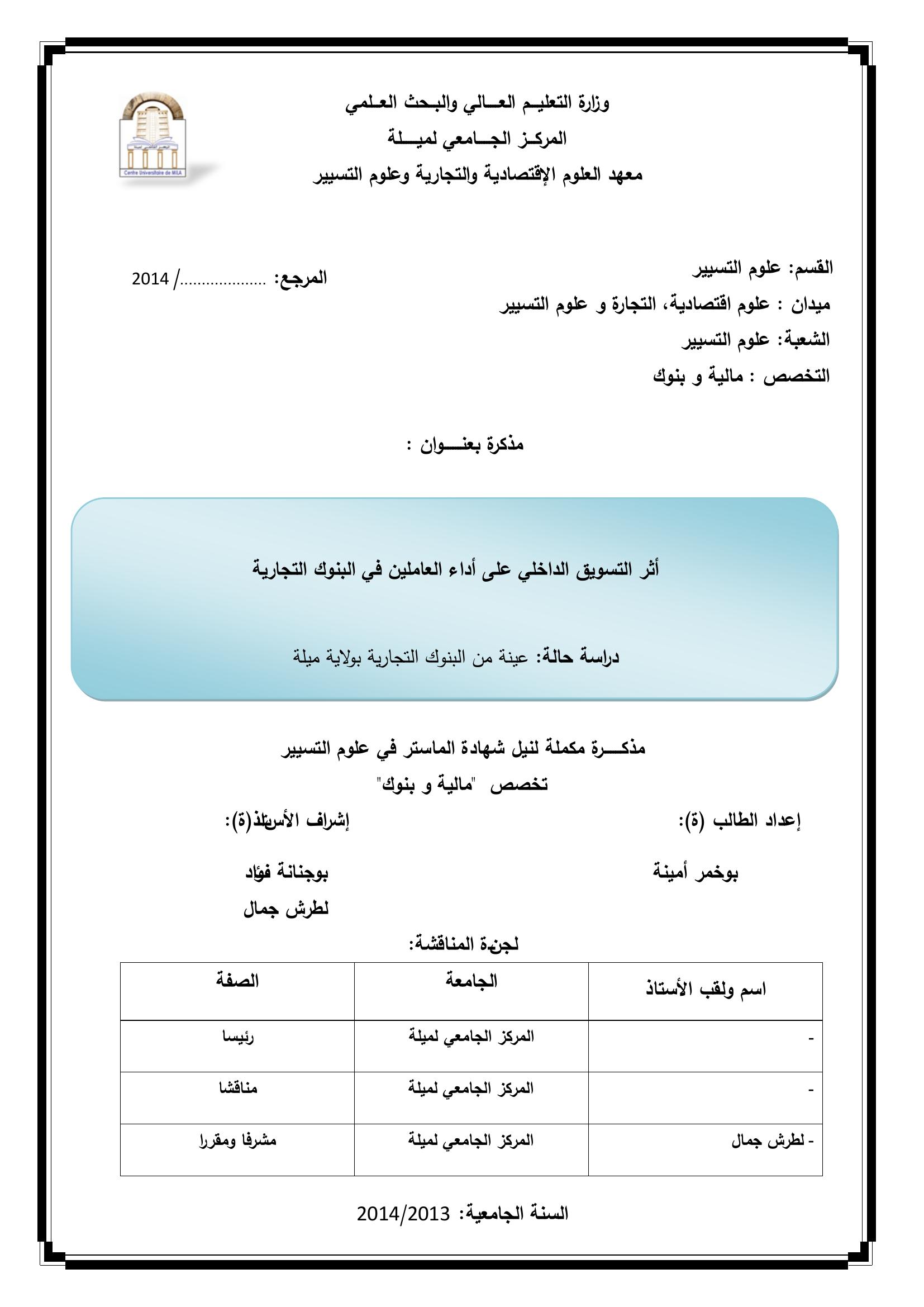 بوخمر أمينة & لطرش جمال(مشرفا) (2014). أثر التسويق الداخلي على أداء العاملين في البنوك التجارية دراسة حالة عينة من البنوك التجارية بولاية ميلة.